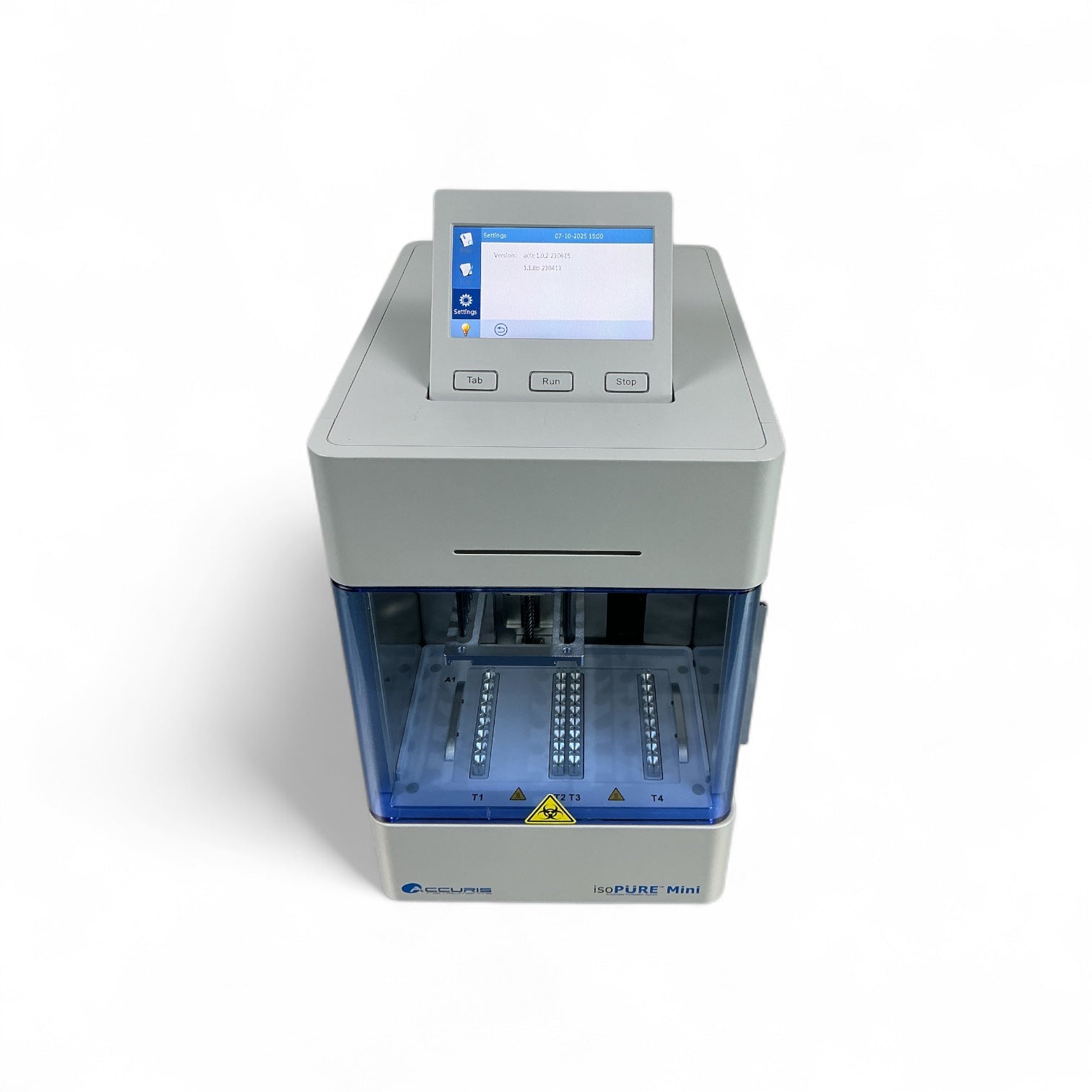 The Accuris isoPURE Mini AP1016 is a compact automated purification system designed for magnetic bead-based nucleic acid extraction. Manufactured in June 2023, it features a touchscreen interface and built-in protocol control for efficient lab workflows. This unit includes the power supply but does not come with software or additional accessories.