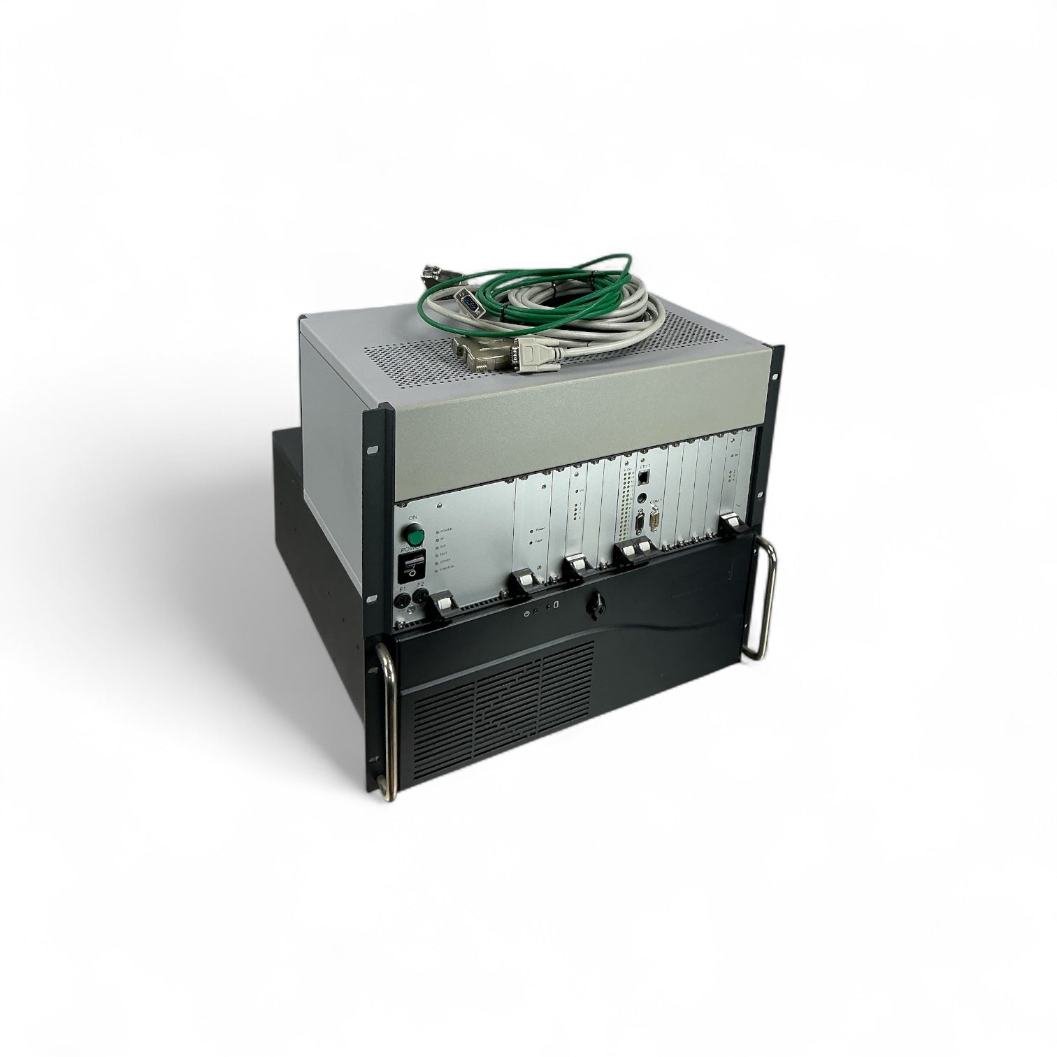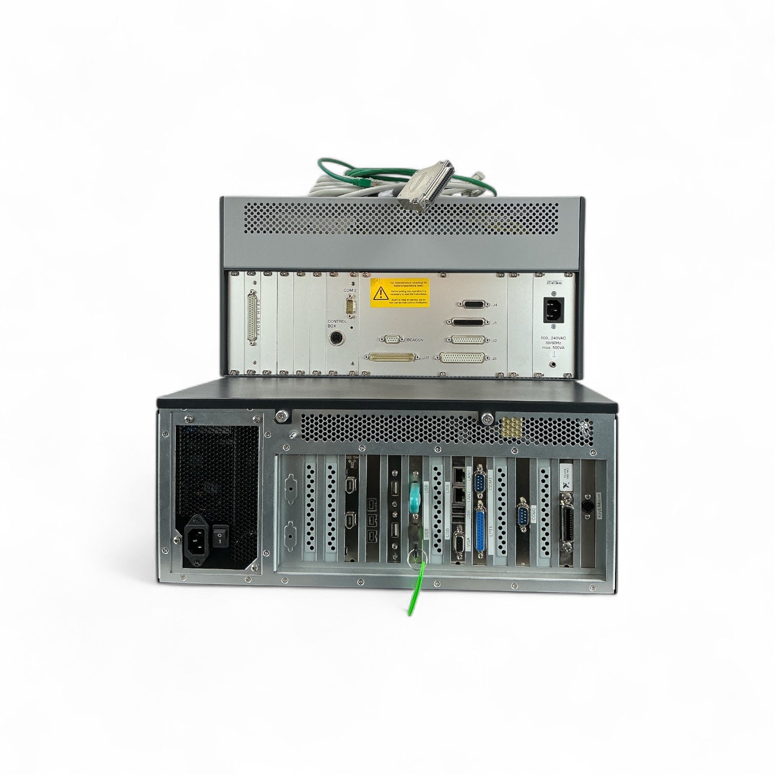 Kontron KISS-4U 960-A system configured for use with the Cascade Microtech BlueRay 200 (PA 200) probe station. Includes ProbeBench 7.7 software suite with user-level passwords and HASP keys, along with National Instruments LabVIEW 2010 SP1. The setup features a Core 2 Duo processor, Windows XP Pro, and comes with the original kernel controller and all shown cables.
