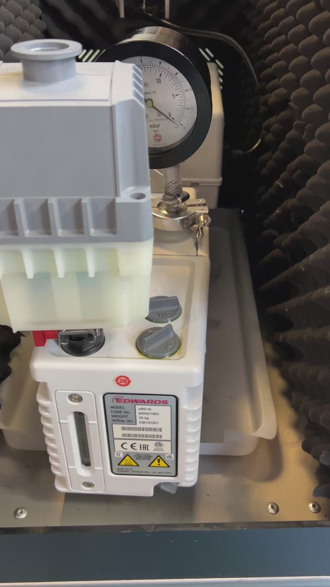 Vacuum Performance: Analog absolute pressure gauge indicates < 1 mbar (~0.75 torr) with inlet blanked off after warm-up.