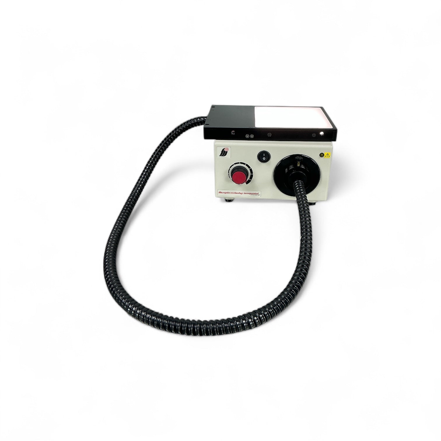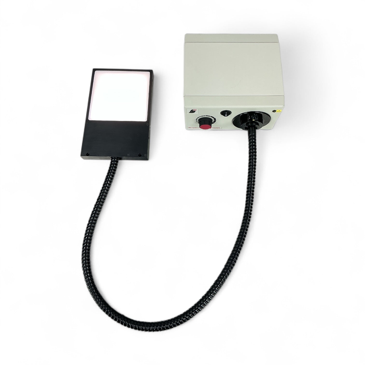This setup includes a Fiberoptics Technology LO-35 LED light source paired with the FTIBL16309 machine vision backlight. Ideal for stereo microscopes or imaging applications requiring transmitted or diffuse illumination. Tested and fully functional. Includes power cord.