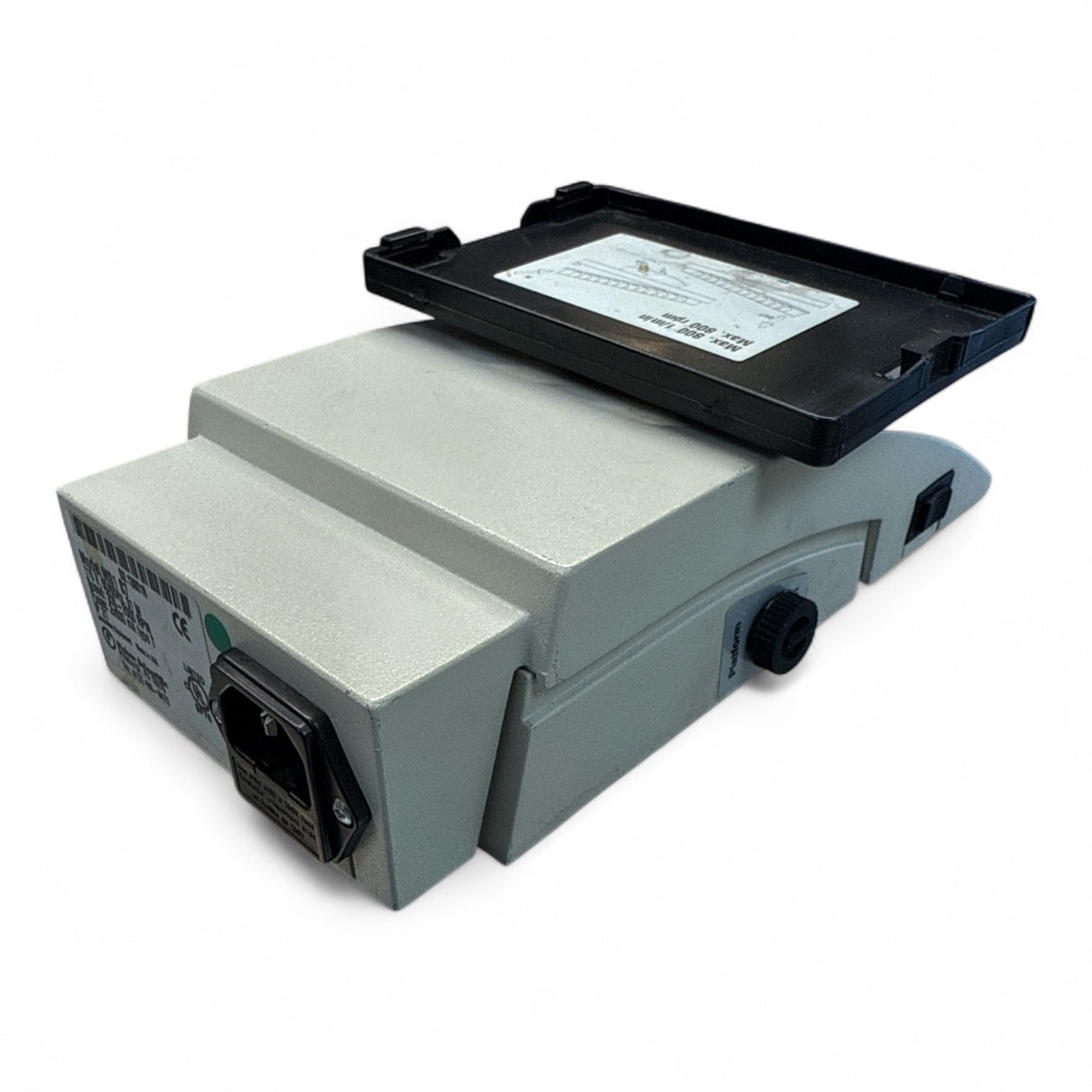 This Fisher Scientific MS1 S7 vortex mixer is a compact and versatile laboratory mixer, offering variable speed control from 200 to 2500 RPM. The unit is ideal for mixing small volumes in tubes, microplates, or other lab containers. It features a simple dial interface, a sturdy base, and a removable platform with markings for various mixing applications. This unit powers on and runs properly. At high RPMs, the platform may dislodge, likely due to a missing tray that would typically weigh it down and secure it in place during operation. The platform itself does not appear to be damaged. Some paint has chipped off the dial but all settings remain clearly visible.