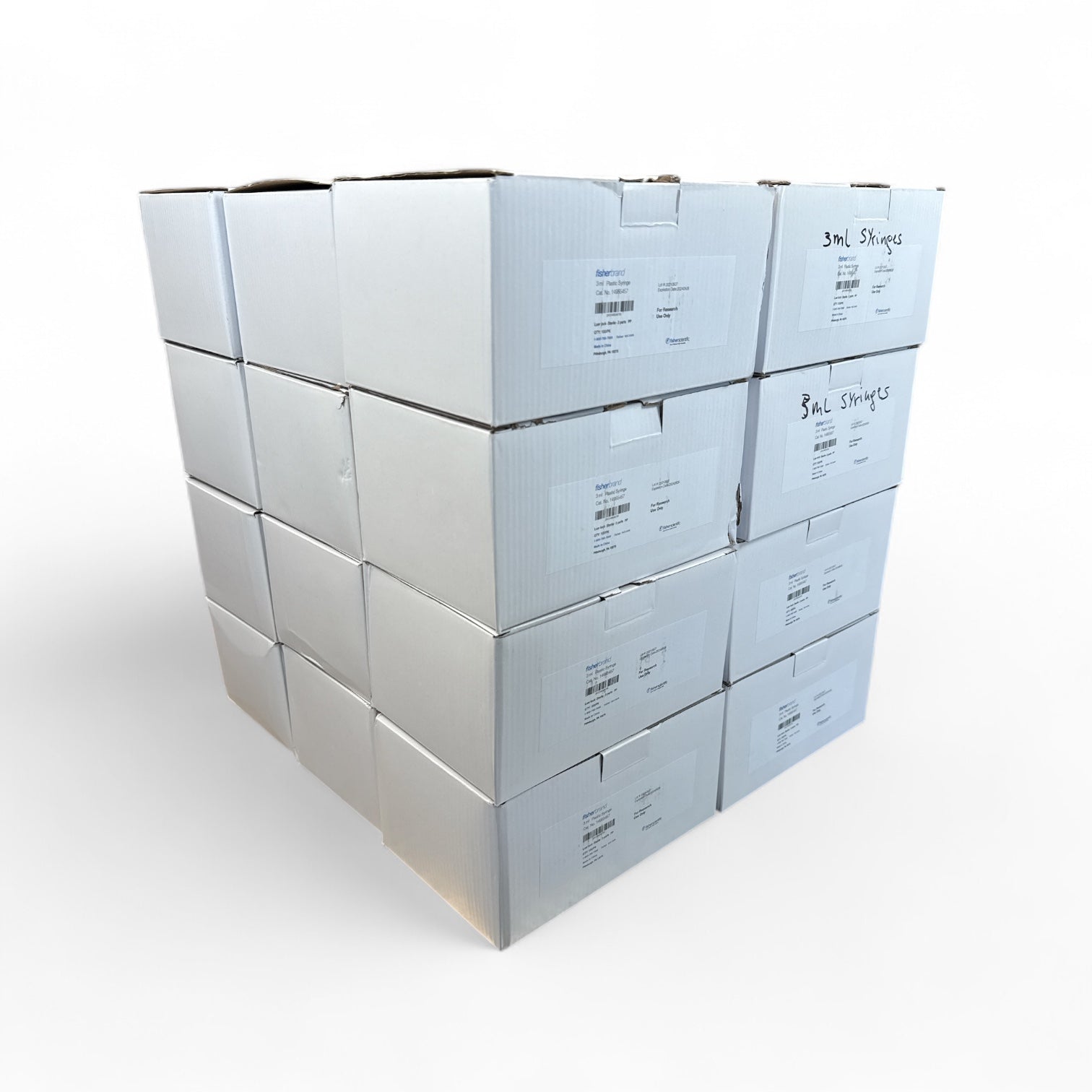 These Fisherbrand 3mL plastic syringes are individually sterile-packed with luer lock tips and three-part construction. Ideal for precise dosing in research settings, this lot includes 24 factory-sealed boxes, each containing 100 syringes for a total of 2,400 units. Designed for research use only, they’re clearly labeled and come with expiration dates visible on the packaging.