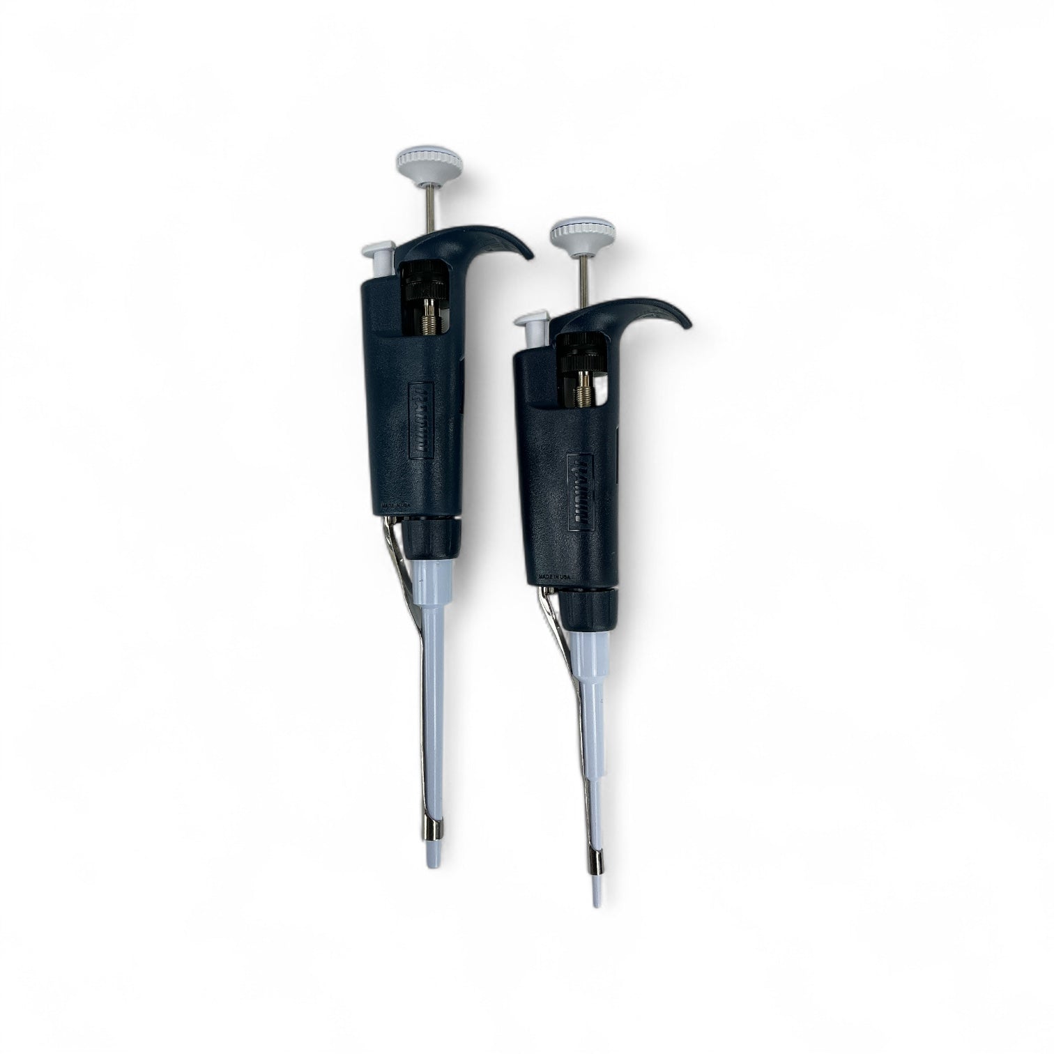 Set of six Gilson/Rainin Pipetman pipettes: PR-2, P10, P20, PR-200, P200, and P1000. All units have been tested for basic function. Calibration is expired. Includes one wall mount and one carousel stand.