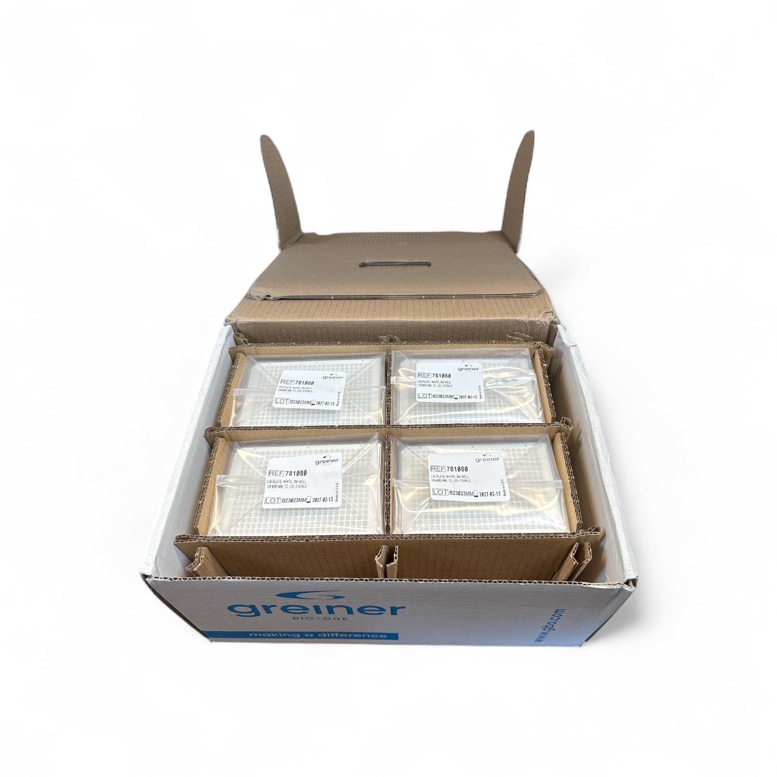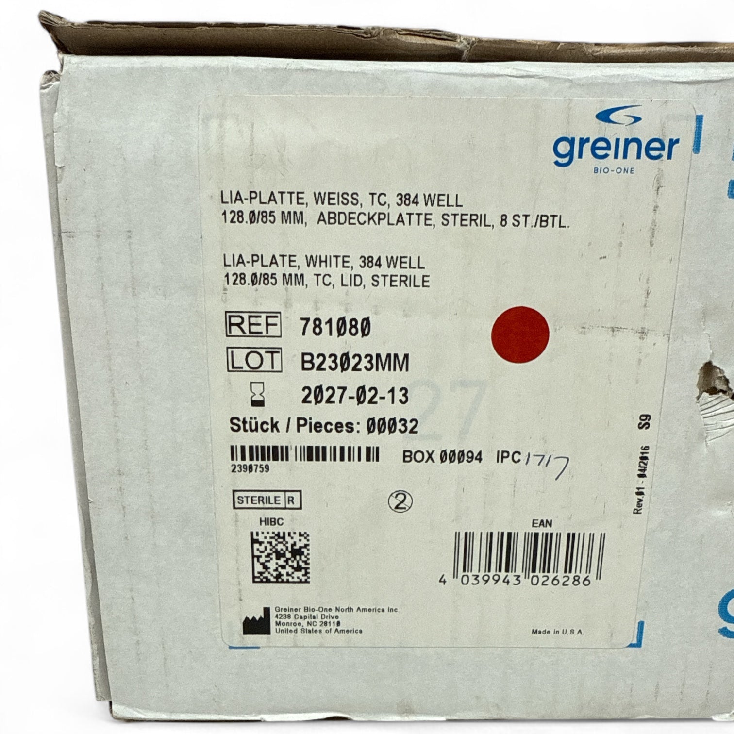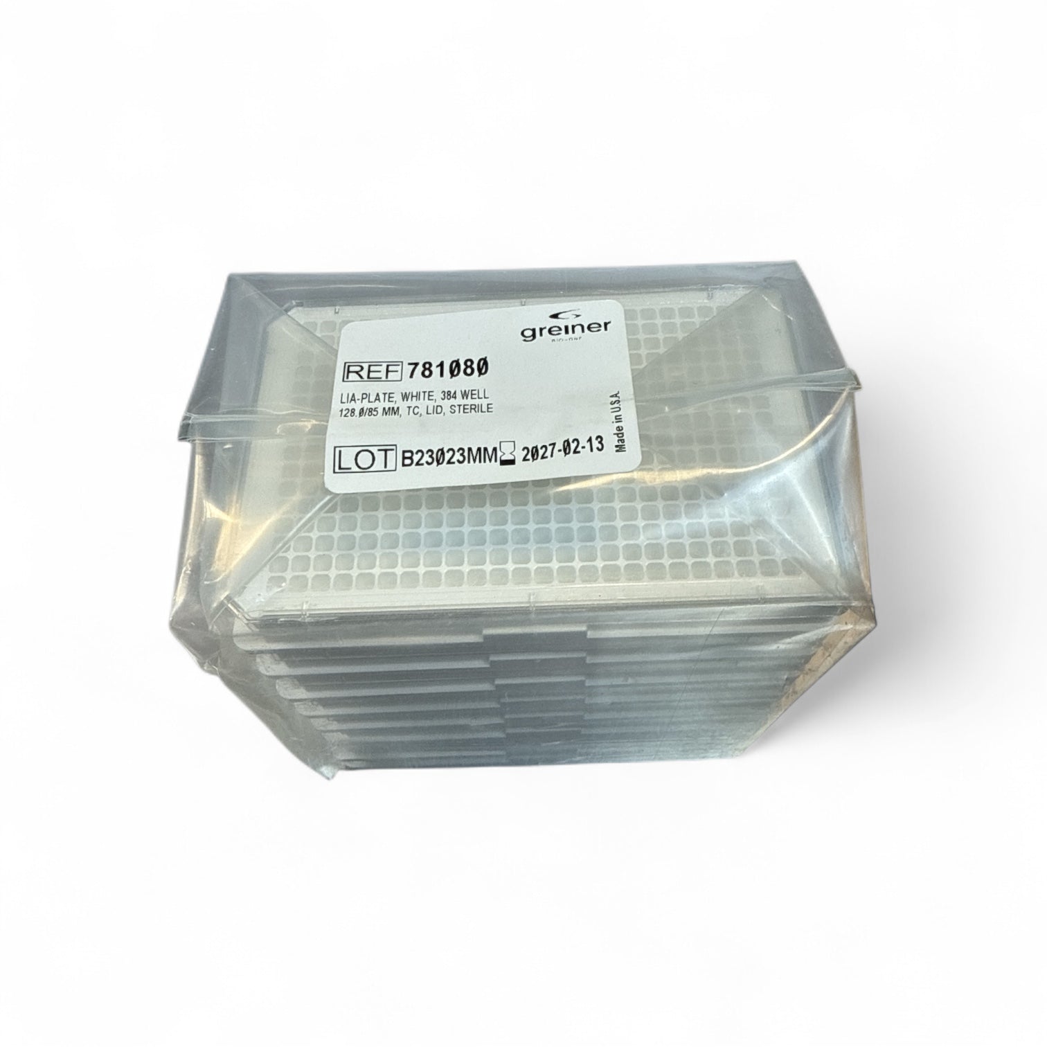 Optimize your cell culture workflows with these Greiner Bio-One 384-well white LIA-Plates. Designed for high-throughput applications, each plate features 384 wells in a standard 128 x 85 mm format with TC-treated surfaces and lids. This box originally held 32 plates, but one sleeve is missing—leaving a total of 24 brand-new, unused plates still sealed in their sterile packaging.