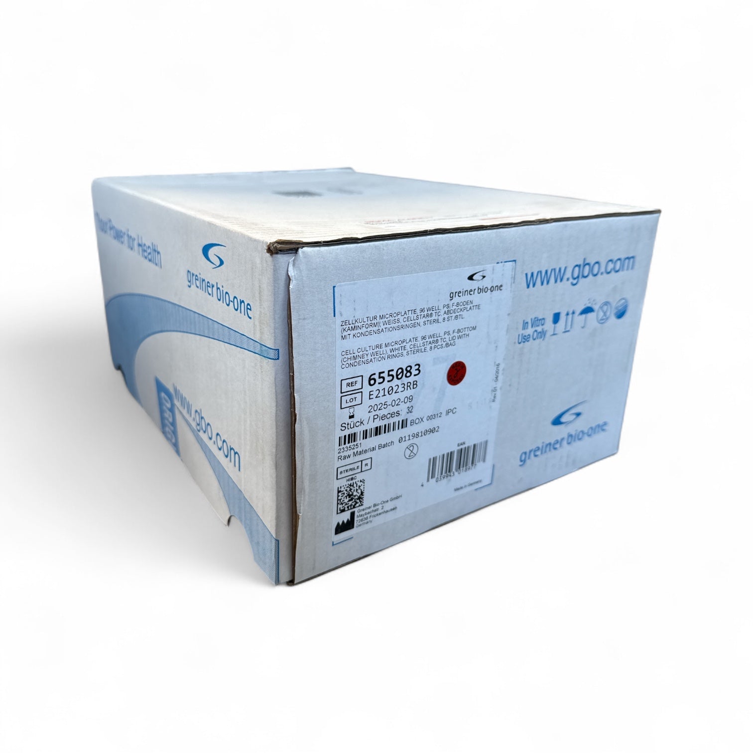 Greiner Bio-One Cellstar® TC-treated 96-well microplates are designed for optimal cell culture performance. These sterile, F-bottom (chimney well) plates are made of polystyrene and include condensation ring lids for improved humidity control. Each tray is individually sealed in a set of 8, and this full box includes 32 trays total.