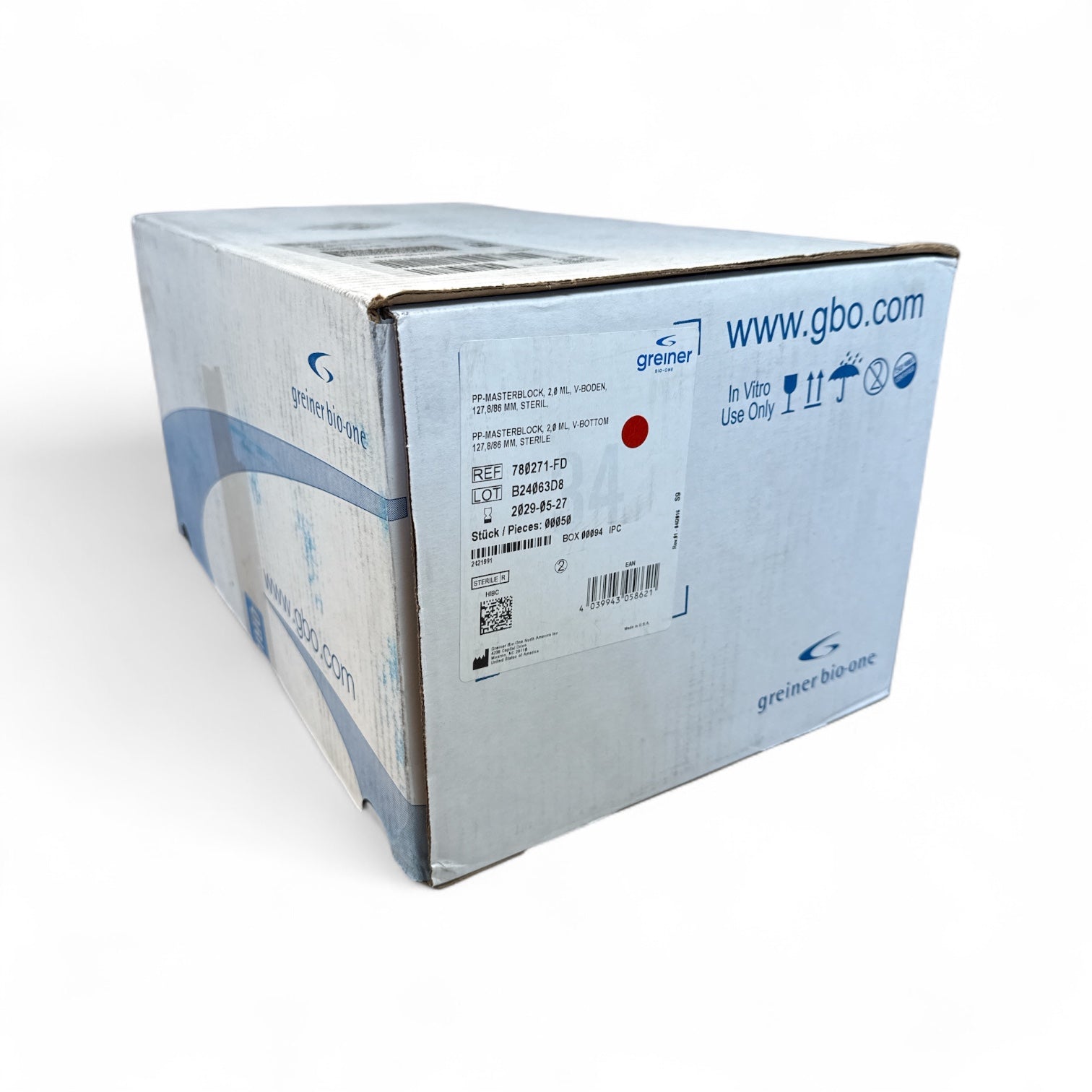 This listing includes 50 new Greiner Bio-One Masterblock 2.0 mL deep well plates with V-bottoms. These sterile polypropylene plates are precision-manufactured and DNase/RNase, human DNA, and pyrogen free, making them ideal for high-throughput sample storage, processing, or culturing. Each plate is individually sealed and clearly labeled. Ideal for life sciences, molecular biology, and pharmaceutical labs.