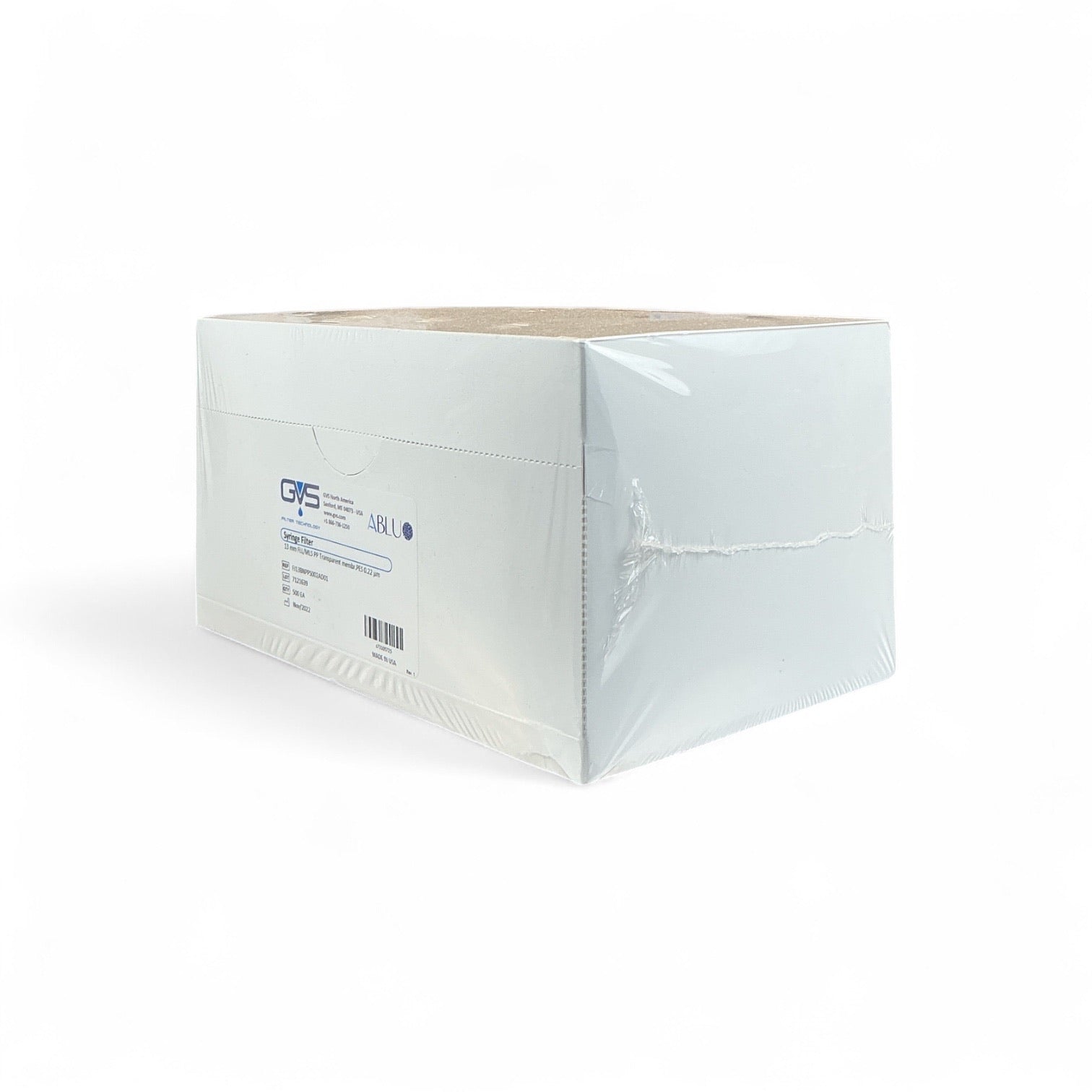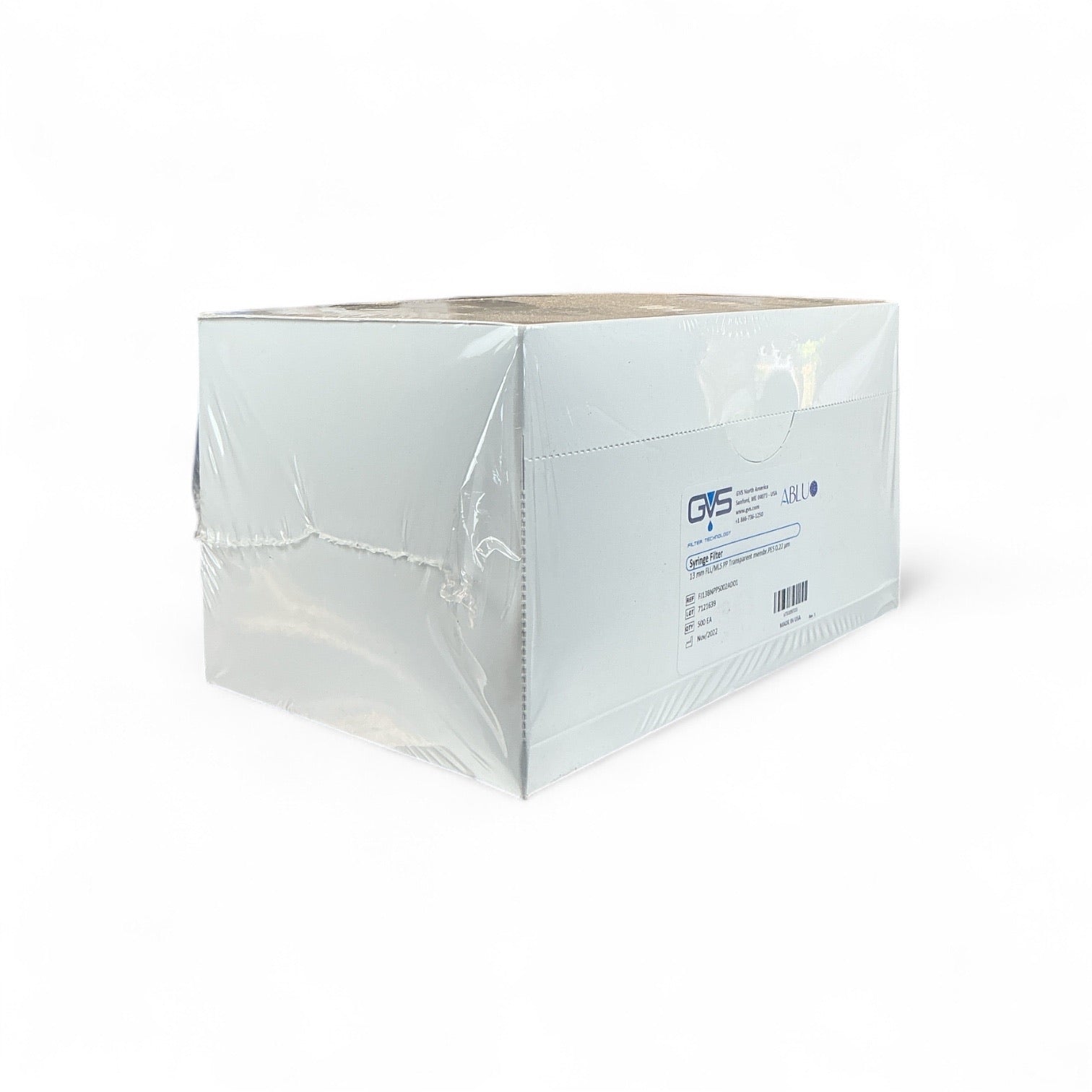 This listing is for a sealed box of GVS ABLUO Syringe Filters, model FJ13BNPPS002AD01. Each filter features a 13mm polypropylene housing with a transparent polyethersulfone (PES) membrane, offering precise 0.22µm filtration. These filters are ideal for high-performance liquid applications in laboratory or pharmaceutical settings. Box contains 500 individually packaged units.