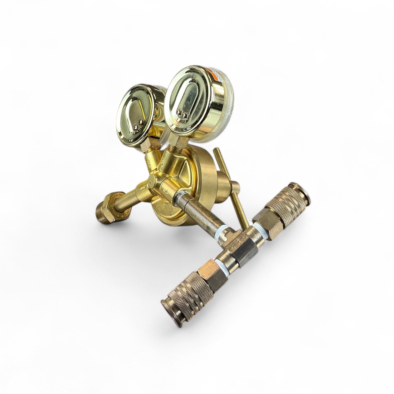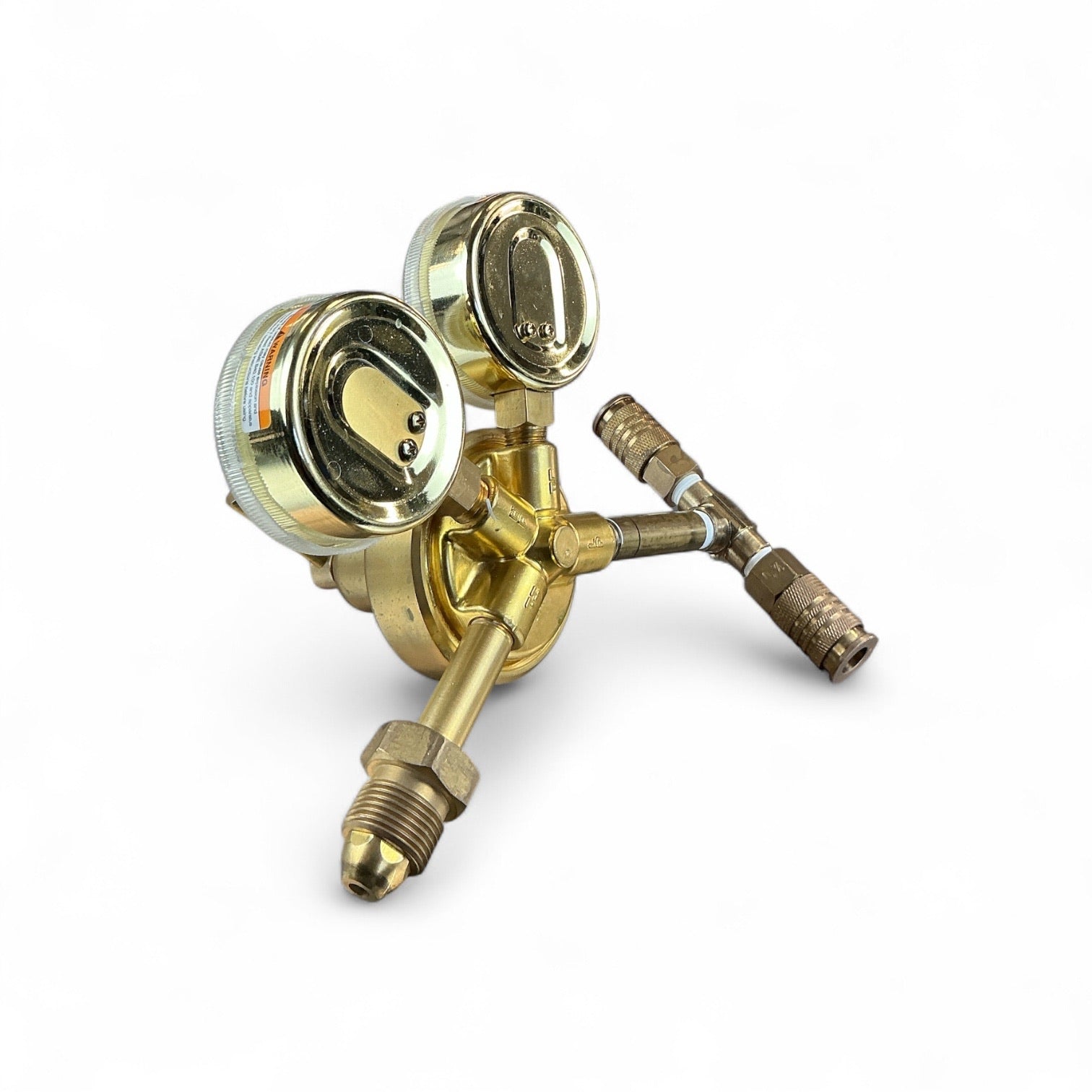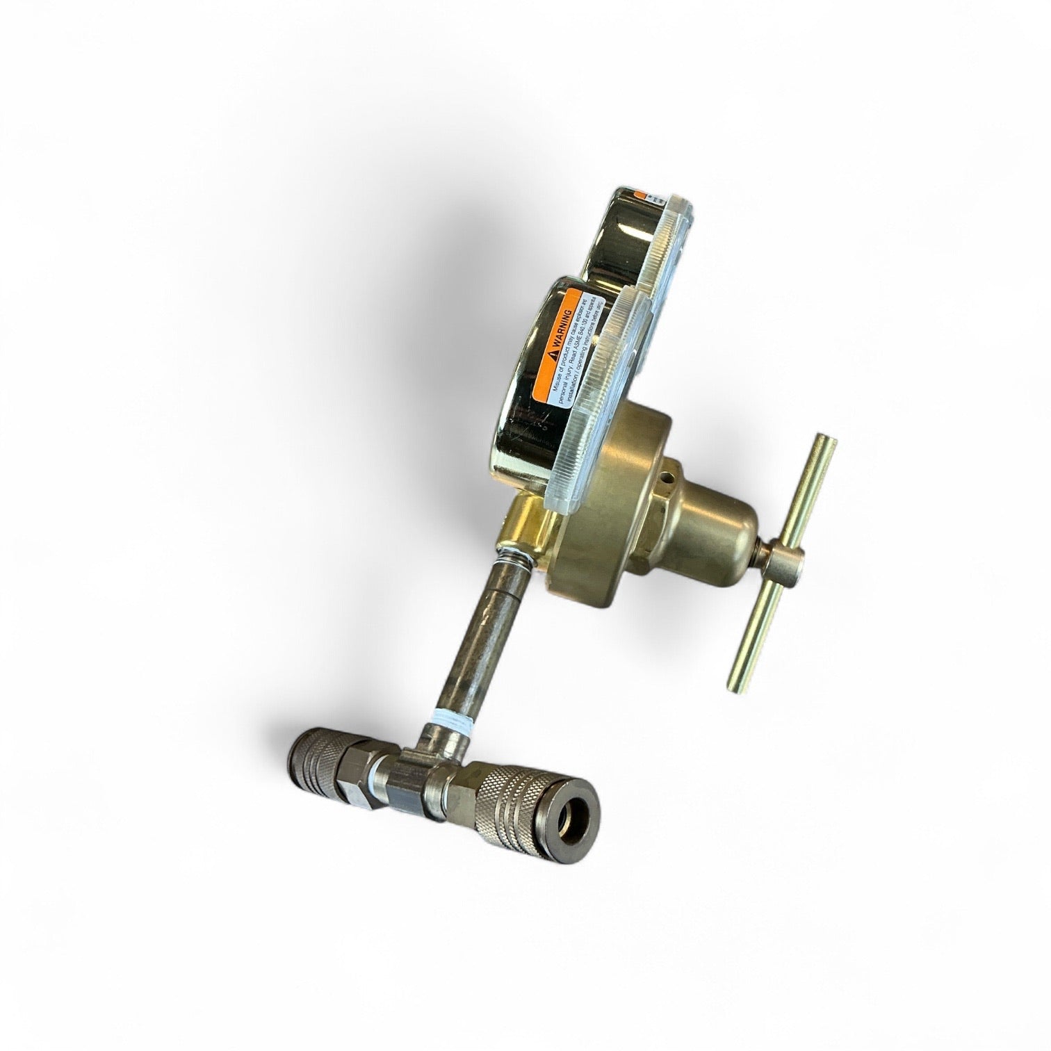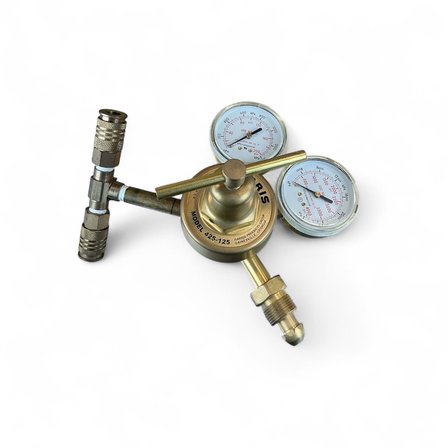 This Harris 425-125 gas regulator is a durable, dual-gauge unit designed for precision pressure control. It includes a secure T-bar handle and a quick-connect extension fitting on the outlet for added versatility. The body is solid brass with clear, legible gauges for both delivery and inlet pressure readings.