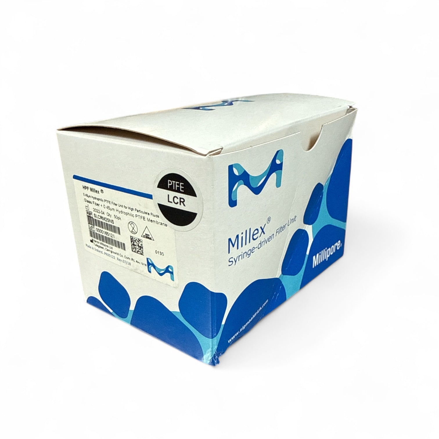 The Millipore Millex HPF SLCRM25NS is a premium-grade syringe-driven filter unit designed for high particulate fluids. These filters utilize a 0.45μm hydrophilic PTFE membrane supported by a glass fiber prefilter, making them ideal for filtration of aggressive or particle-laden solutions. This box contains 50 new, individually packed units and was originally supplied in a sealed carton, which has been opened. The units themselves are still unused and sealed in inner packaging.