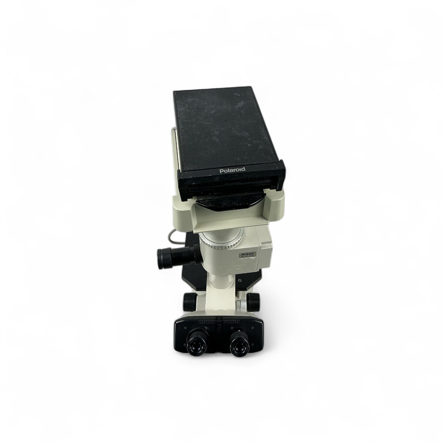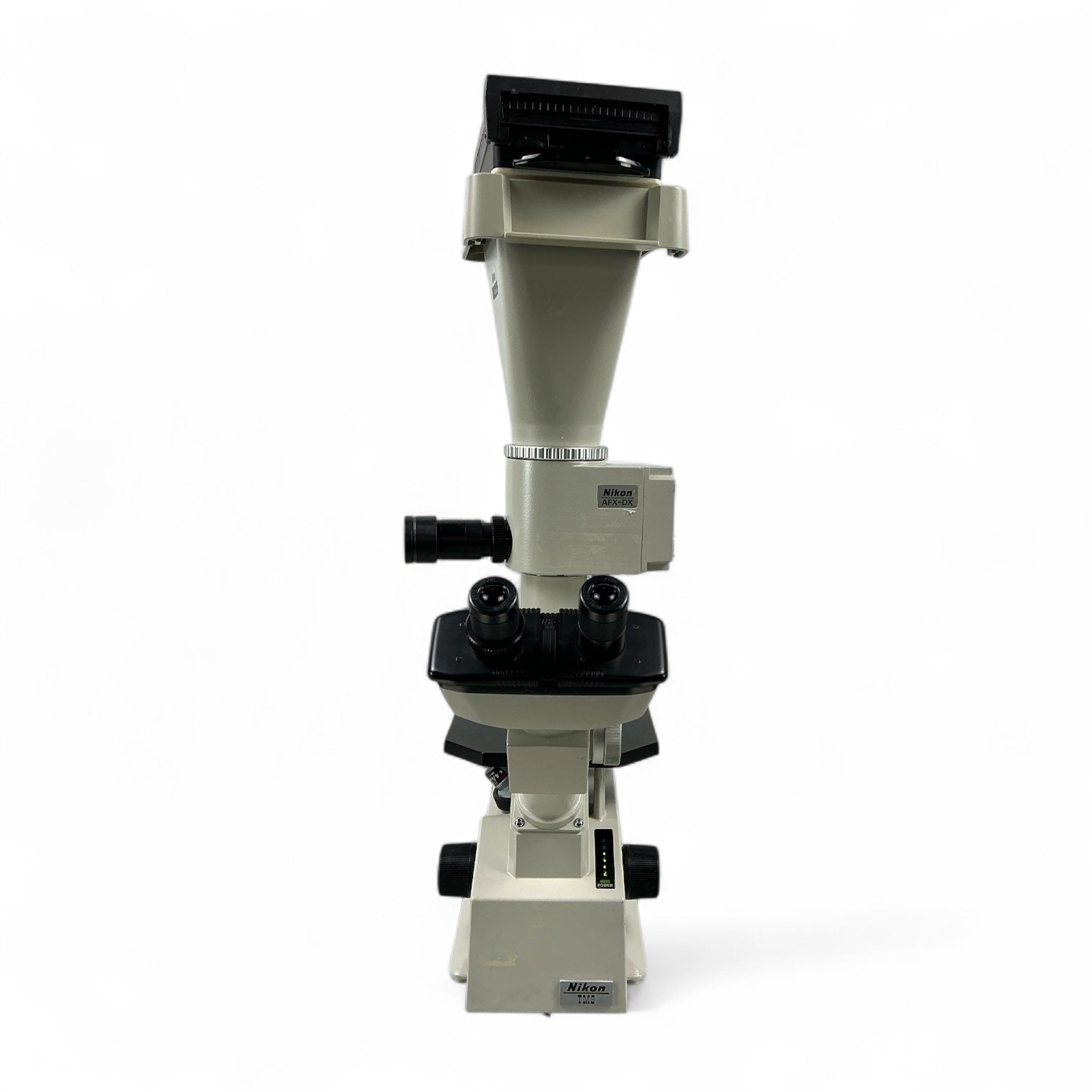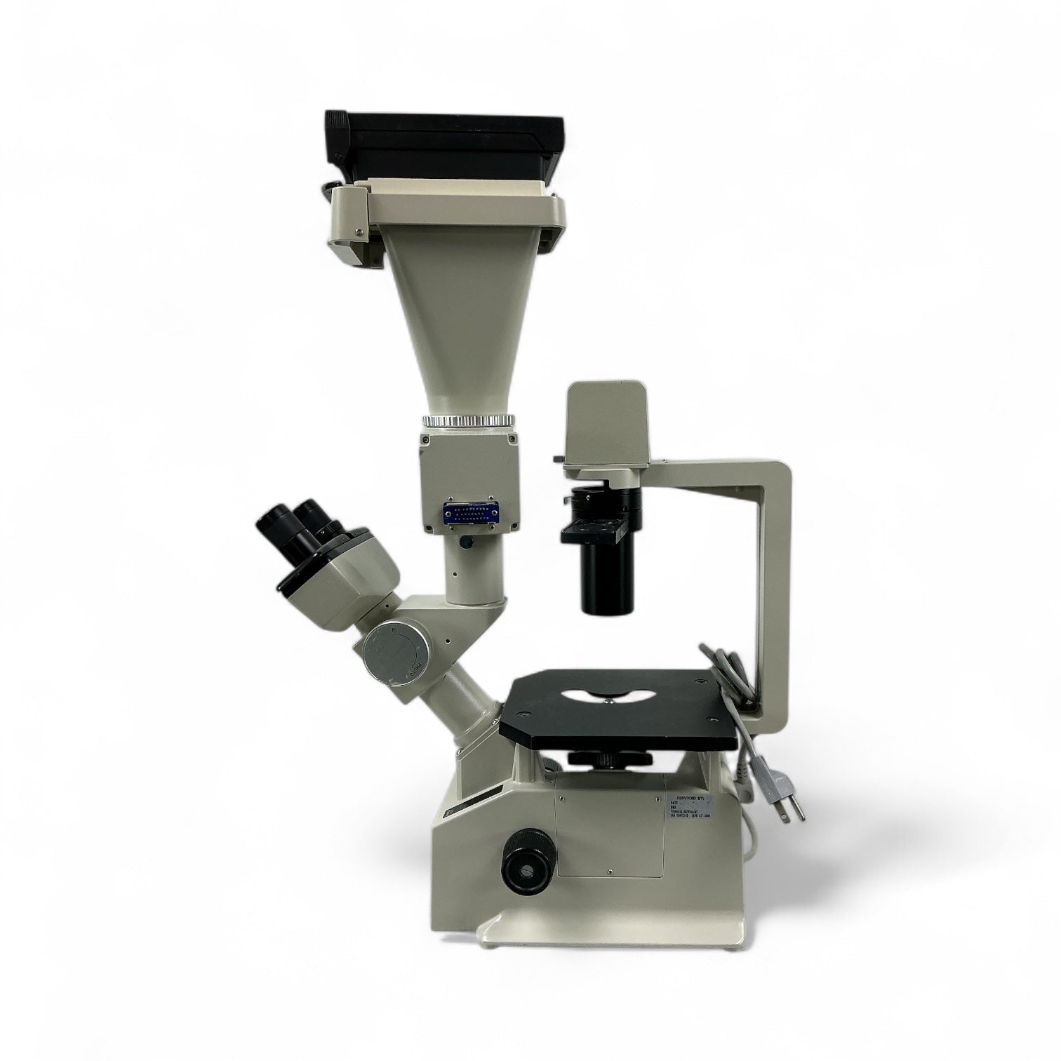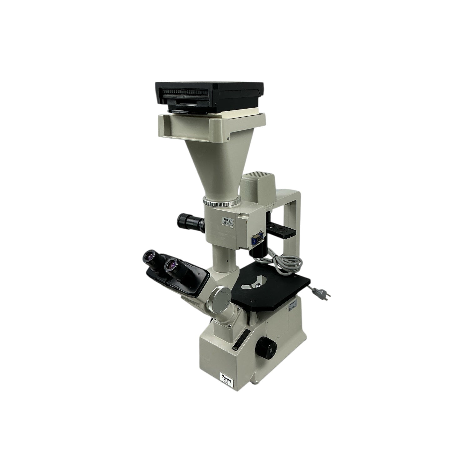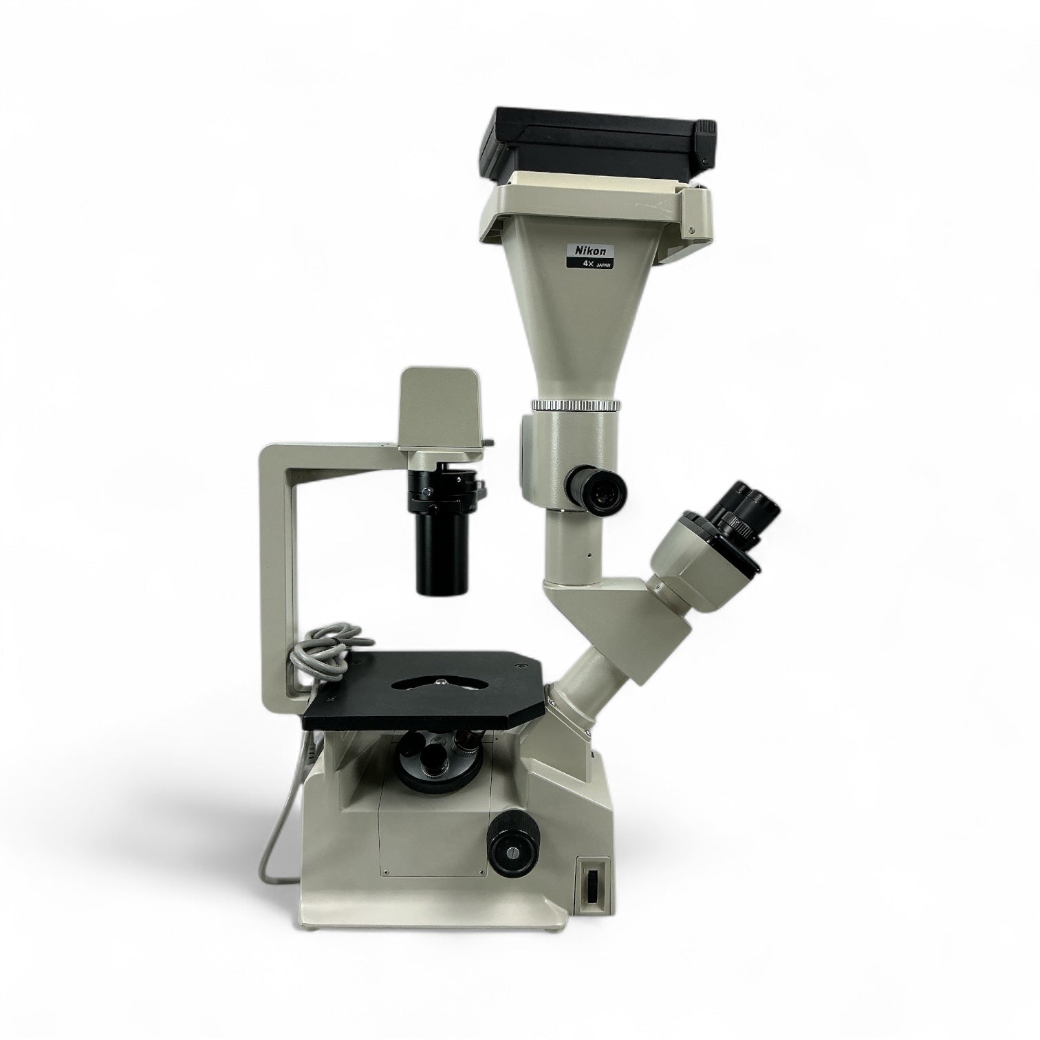 The Nikon TMS-F is a compact inverted microscope designed for cell culture and routine biological applications. This unit includes the AFX-DX photo attachment and three Nikon objectives, providing magnifications of 4x, 10x, and 20x. Ideal for phase contrast and brightfield microscopy in research or clinical settings.