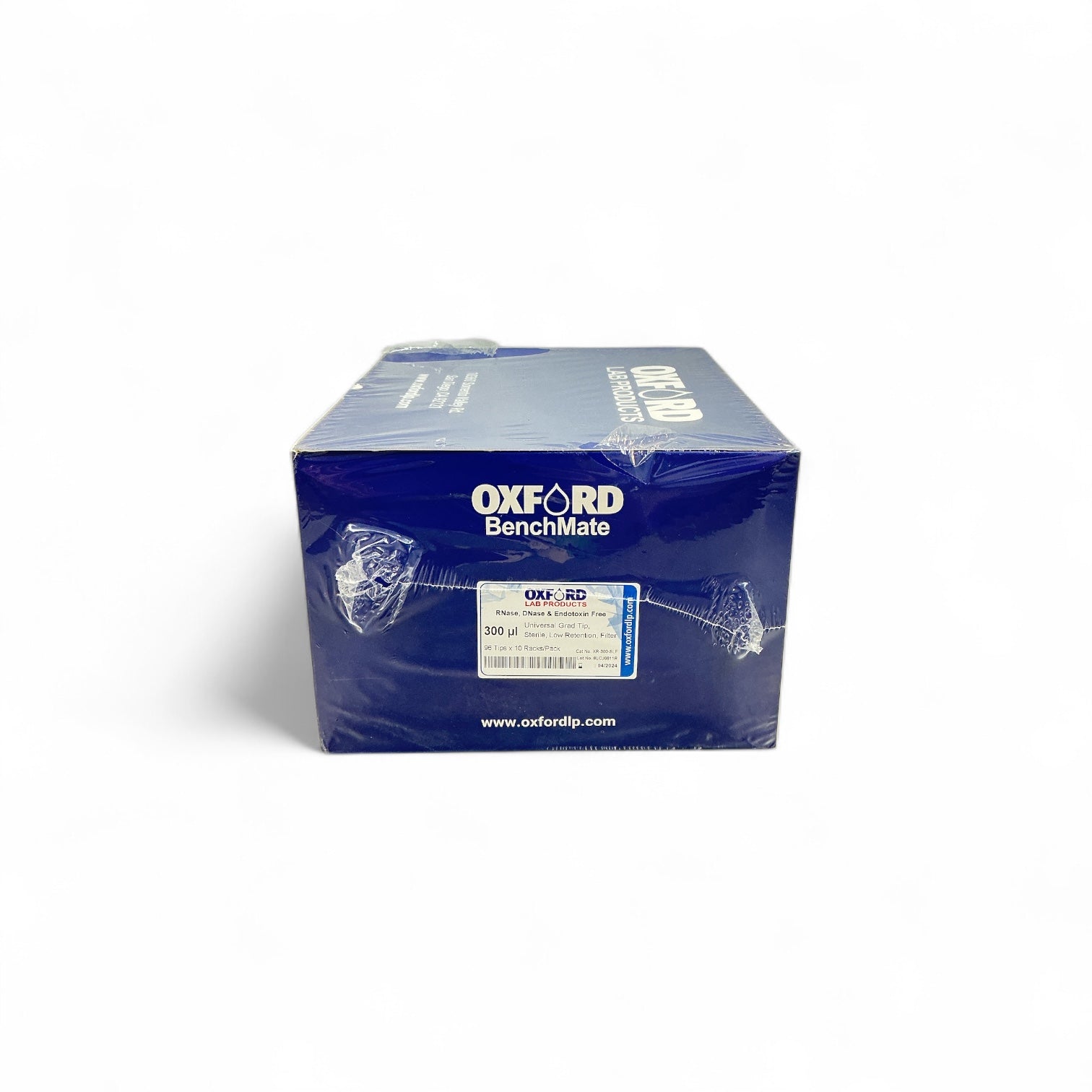This listing includes one pack of Oxford BenchMate 300μL pipette tips, model XR-300-SLF. Each pack contains 10 racks of 96 sterile, low-retention filter tips (960 total). These tips are RNase/DNase free and designed for high-accuracy liquid handling in laboratory workflows. New and sealed with expiration date of 04/2024.