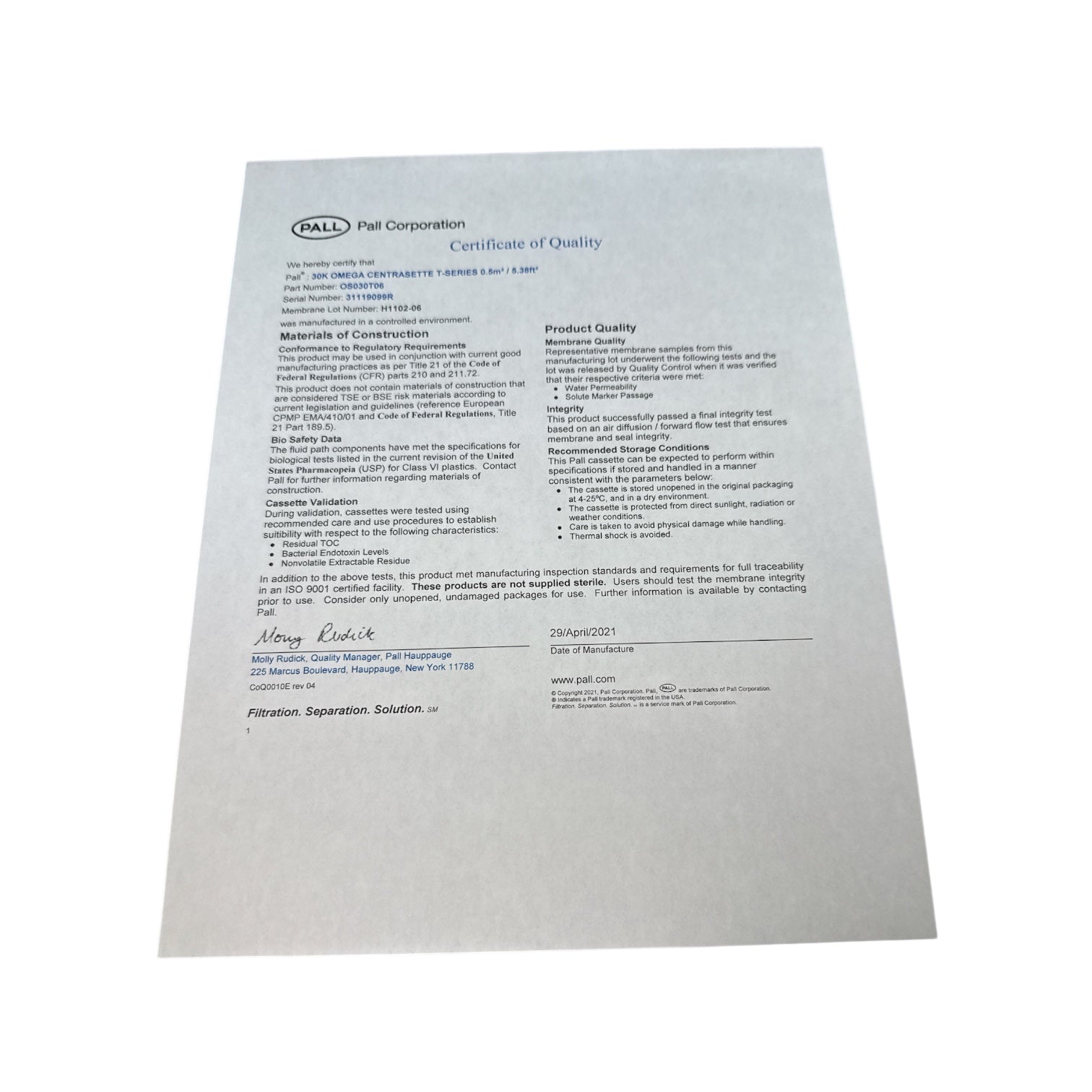 This Pall Omega Centramate T-Series Cassette is a new, unused ultrafiltration unit designed for scalable bioprocessing applications. Featuring a 0.5 m² membrane area with a 30kD molecular weight cutoff, it enables efficient concentration and diafiltration of biological solutions. The cassette is housed in a protective box with the original Pall Life Sciences label and is double-foam packaged to prevent damage in storage or shipping. Includes a quality certificate and is suitable for research and industrial use where sterility is not required.