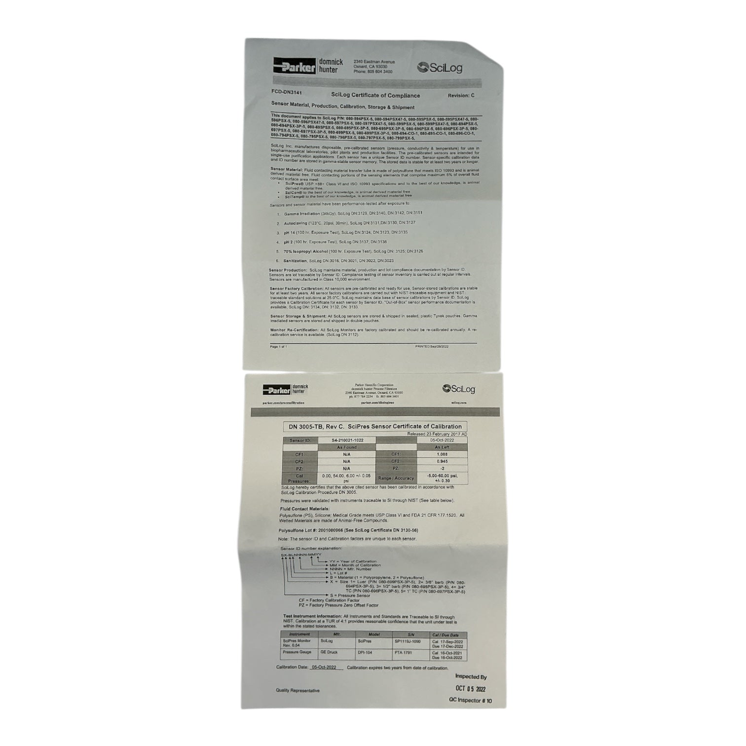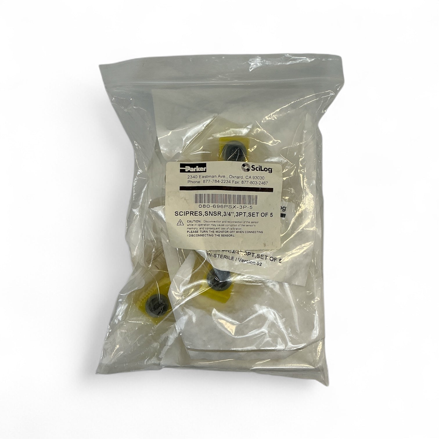This is a new sealed set of 5 Parker SciLog SciPres pressure sensors, part number 080-696PSX-3P-5. Each sensor features a 3/4" hose barb connection and 3-point calibration, intended for use with SciLog bioprocess monitoring systems. These sensors are non-sterile and designed for accurate, real-time pressure sensing in fluid applications.