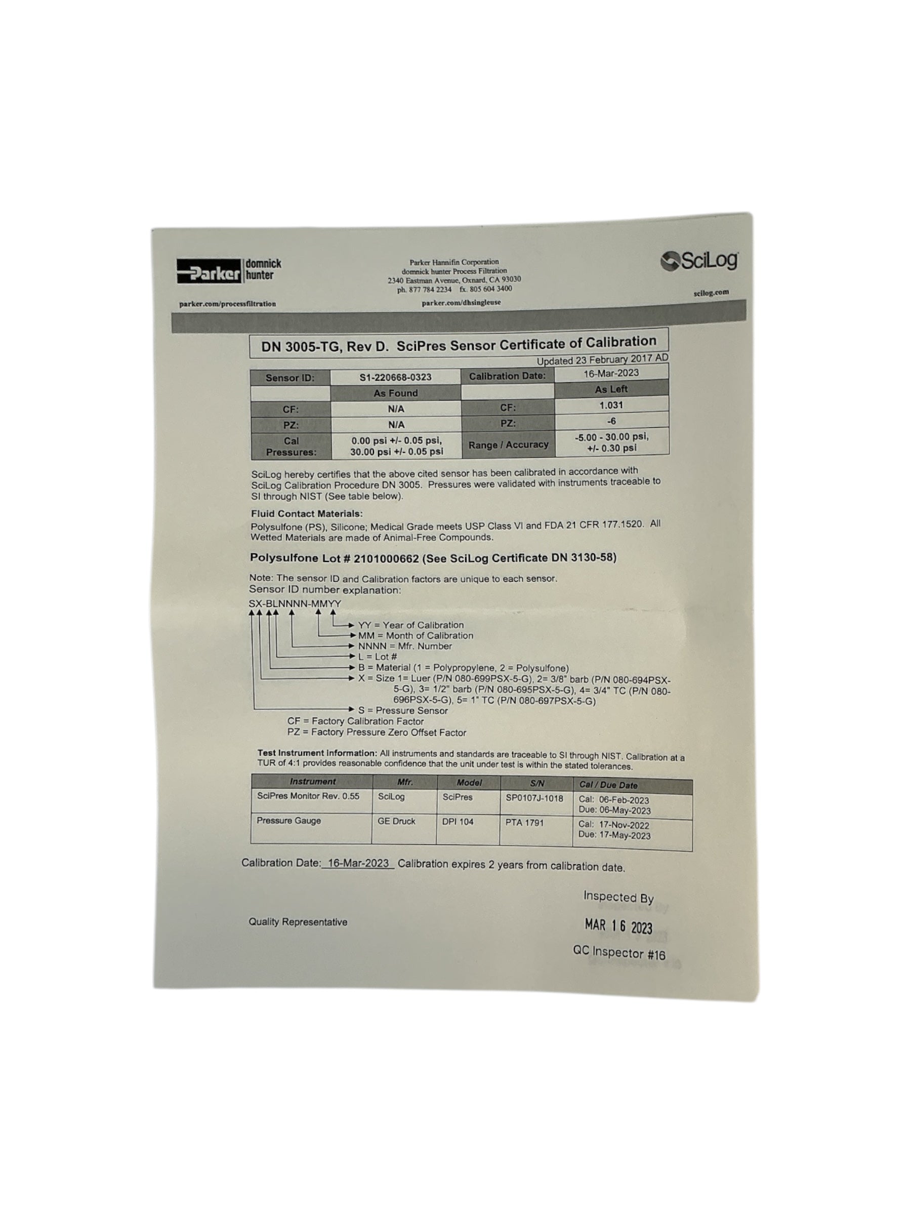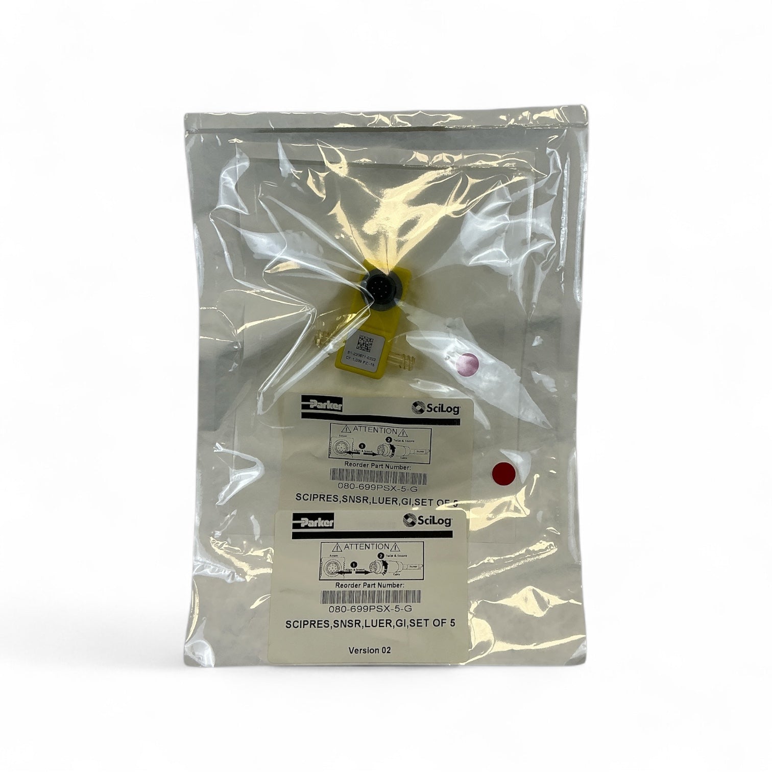 This is a new sealed set of 5 Parker SciLog SciPres sensors with Luer GI fittings, part number 080-699PSX-5-G. These non-sterile Version 02 sensors are designed for pressure monitoring in fluid handling systems. Compatible with SciLog platforms, they offer reliable and accurate data collection in bioprocessing applications.