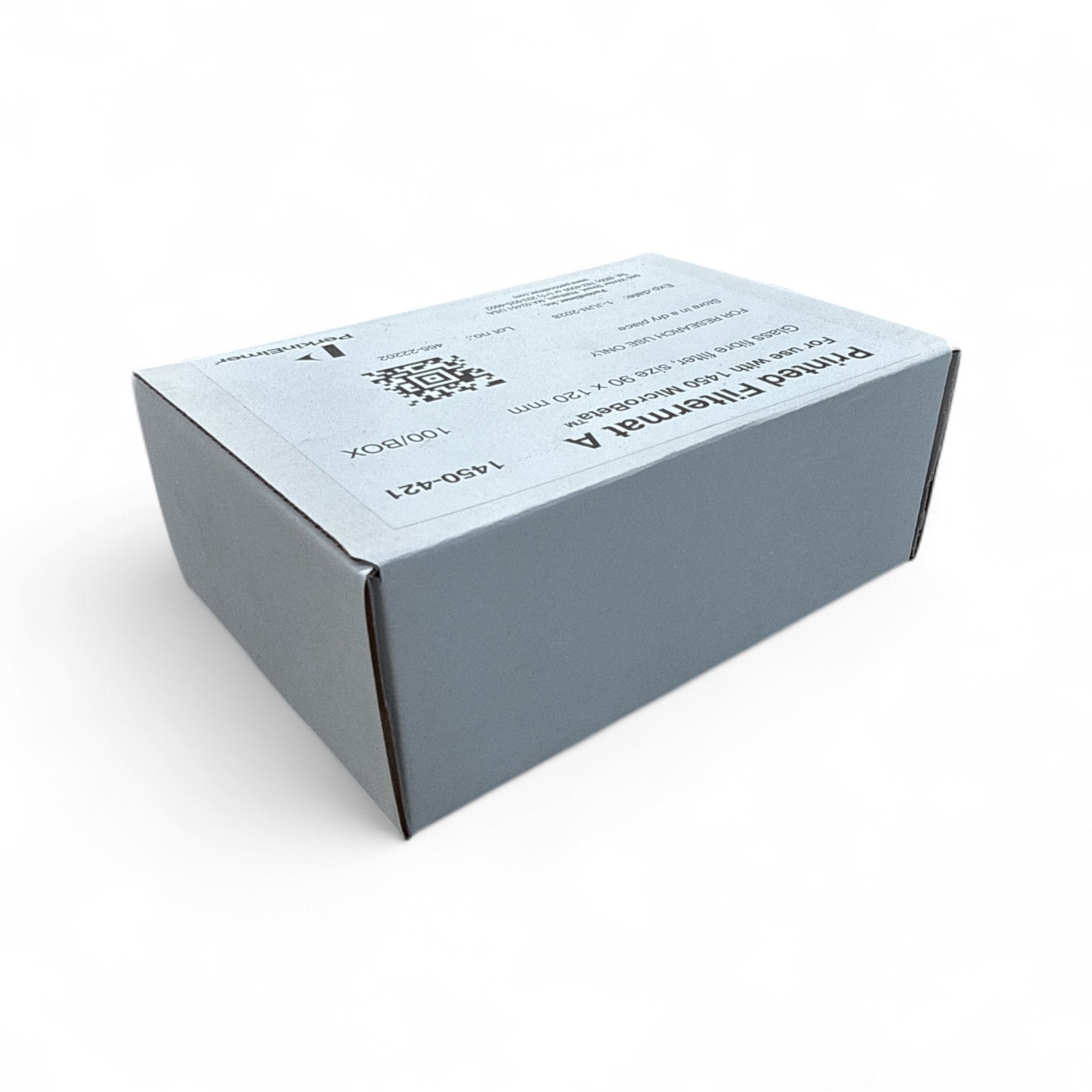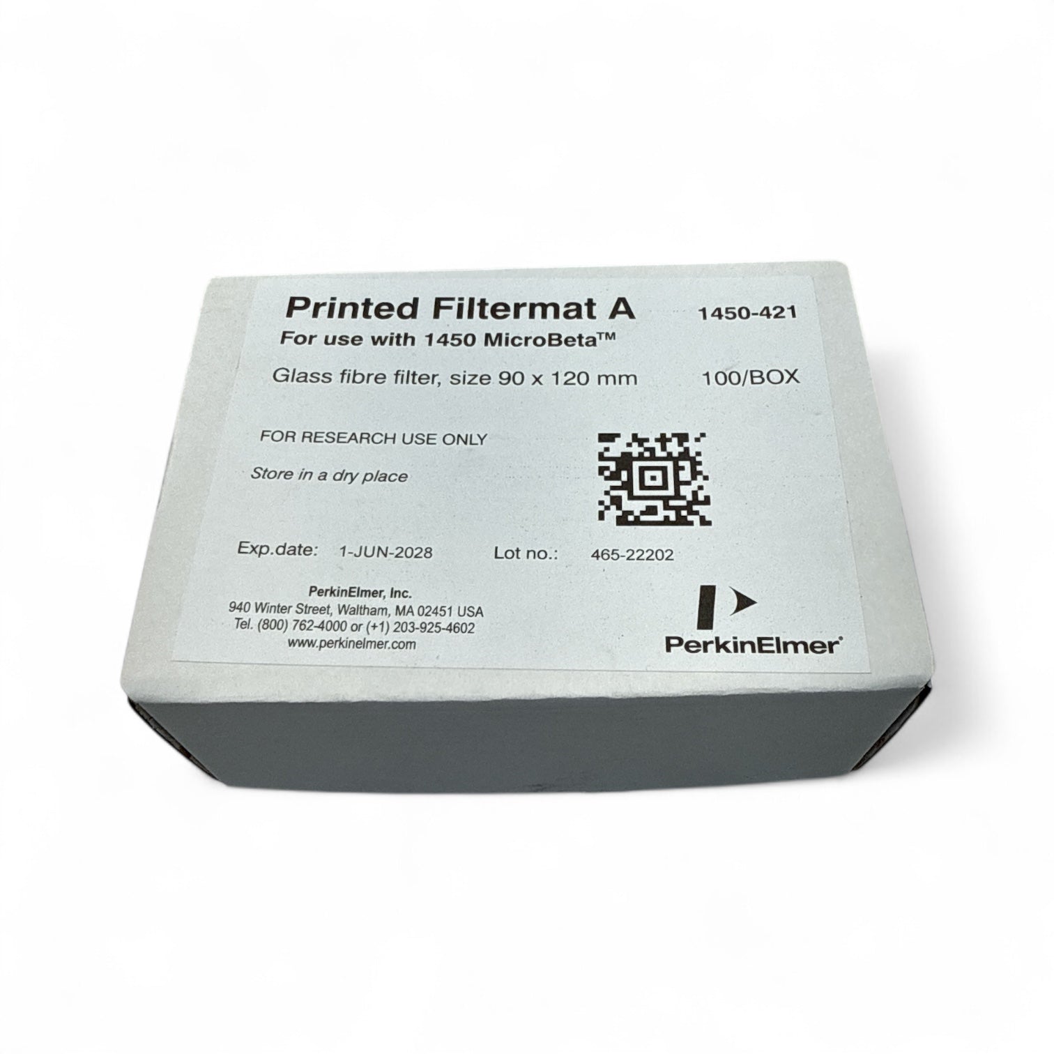 This PerkinElmer Printed Filtermat A (part number 1450-421) is designed specifically for use with the 1450 MicroBeta liquid scintillation and luminescence counter. Each filtermat is made of high-quality glass fibre and printed for precise sample identification. The package includes 100 individual filtermats, each measuring 90 x 120 mm, and is intended for research use only. Ideal for laboratories utilizing MicroBeta systems in high-throughput settings.