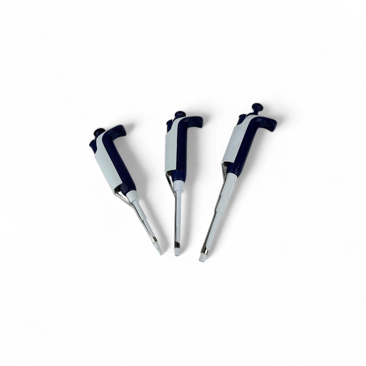 This set includes three Rainin Pipet-Lite XLS single-channel LTS pipettes covering volumes from 2 µL to 1000 µL. Each pipette is equipped with RFID tracking and individually labeled for easy identification. All units are used, in good condition, and feature active calibration through March 6, 2026.