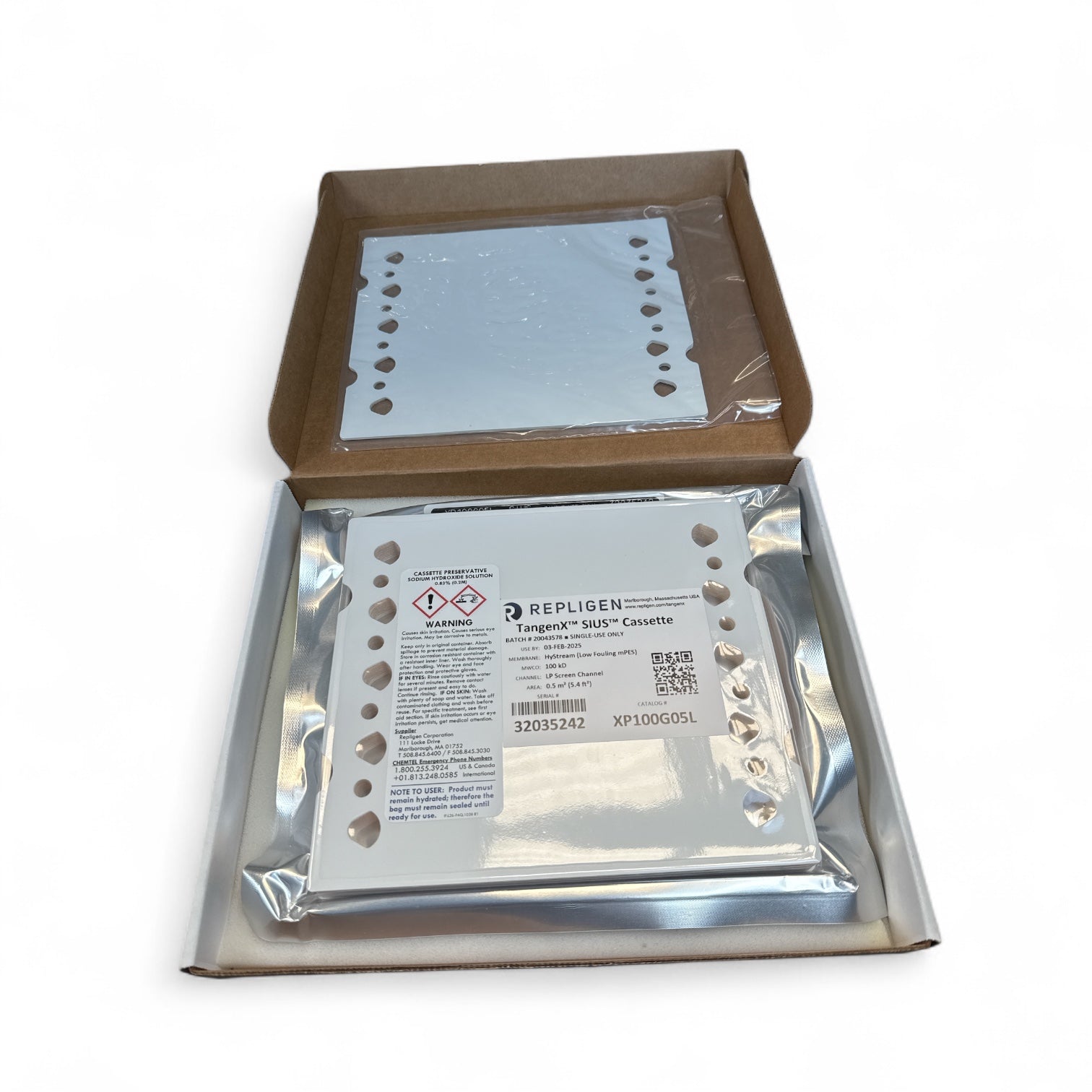 The Repligen TangenX SIUS Cassette is a single-use tangential flow filtration (TFF) module designed for efficient and scalable downstream processing. This cassette features a HyStream low-fouling modified polyethersulfone membrane with a molecular weight cut-off (MWCO) of 100 kD, offering 0.5 m² (5.4 ft²) of filtration surface area. Designed with LP screen channel configuration, it enables consistent and reproducible performance in demanding bioprocessing workflows.