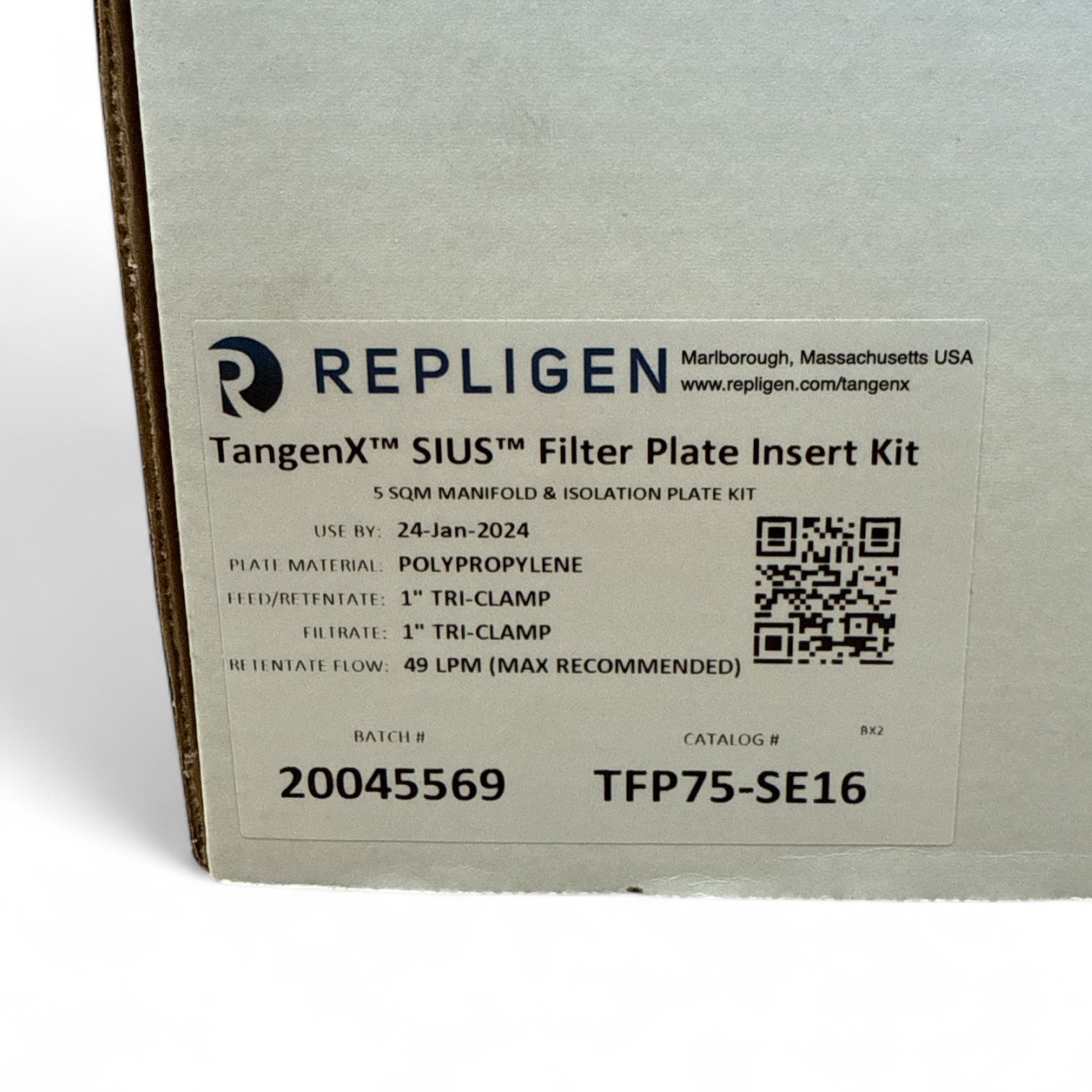 Enhance your bioprocessing system with the Repligen TangenX™ SIUS™ Filter Plate Insert Kit. Designed for 5 square meter manifold and isolation plate configurations, this single-use kit features high-quality polypropylene construction and tri-clamp connections for both feed/retentate and filtrate ports. The setup allows a maximum recommended retentate flow of 49 LPM, ensuring reliable and efficient performance in demanding filtration applications. All components are sealed in original packaging and remain unused.