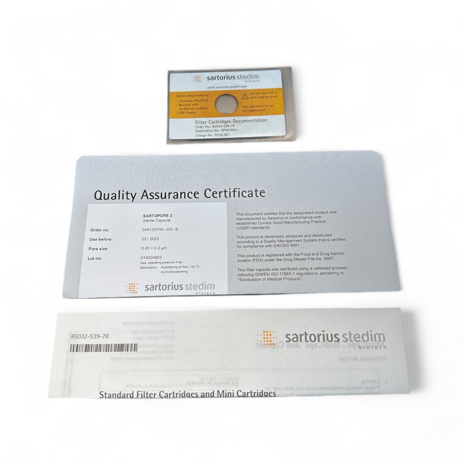Sartorius Sartopore 2 Sterile Capsules are dual-layer membrane filters designed for reliable and efficient sterile filtration in biopharmaceutical applications. This listing includes a sealed box containing Sartopore 2 capsule filters with a 0.45 + 0.2 µm dual-layer PES membrane configuration. Ideal for final filtration of culture media, buffers, or high-value biologicals, these capsules provide high flow rates and low protein binding. This unit is new and unused in factory-sealed packaging, and includes the full Quality Assurance Certificate and Sartorius cartridge documentation.