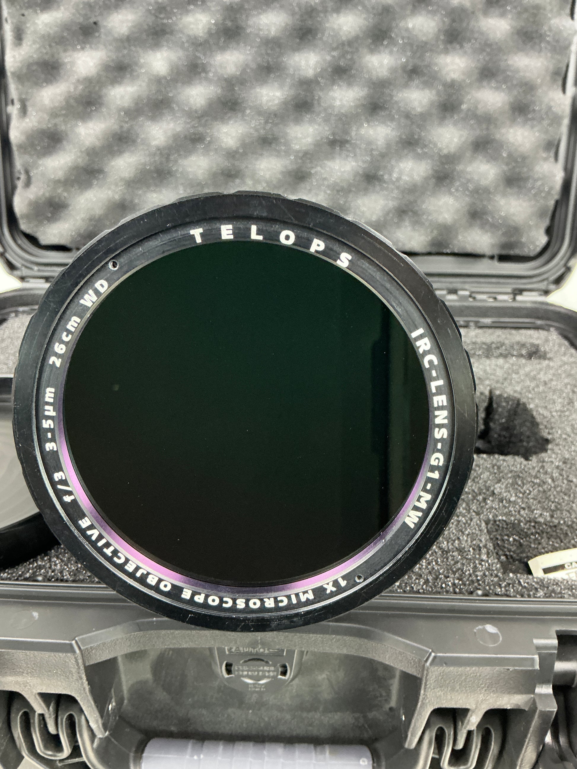 The Telops IRC‑LENS‑G1‑MW is a 1× midwave infrared microscope objective designed for use with high-performance IR cameras. It offers a 3.5 cm working distance and precision optical alignment for thermal imaging applications. This unit shows typical signs of use but remains in good functional condition. Includes fitted protective hard case.