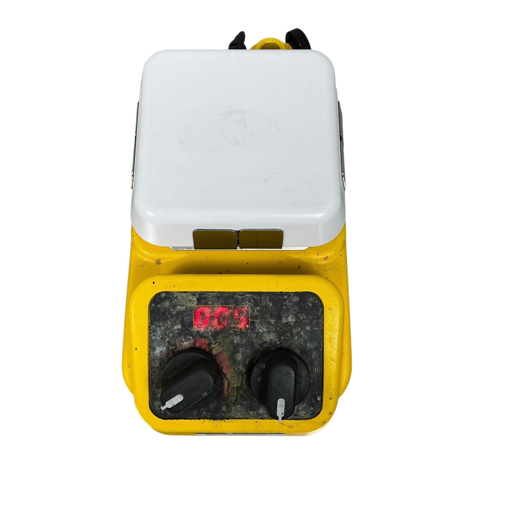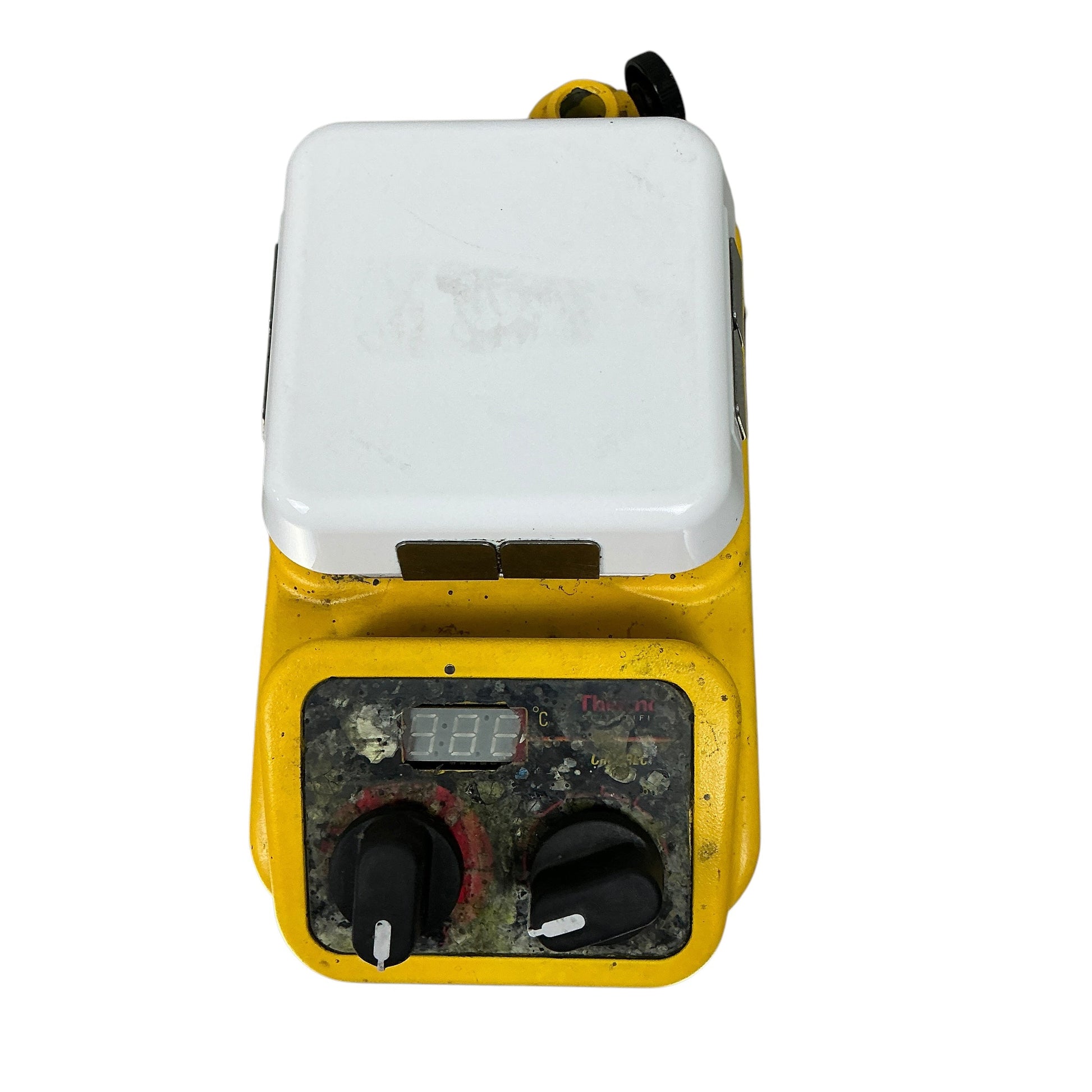 Tested for both heating and stirring functions. The unit is in poor cosmetic condition, with visible surface wear. The digital display is functional but difficult to read due to burn marks and staining.