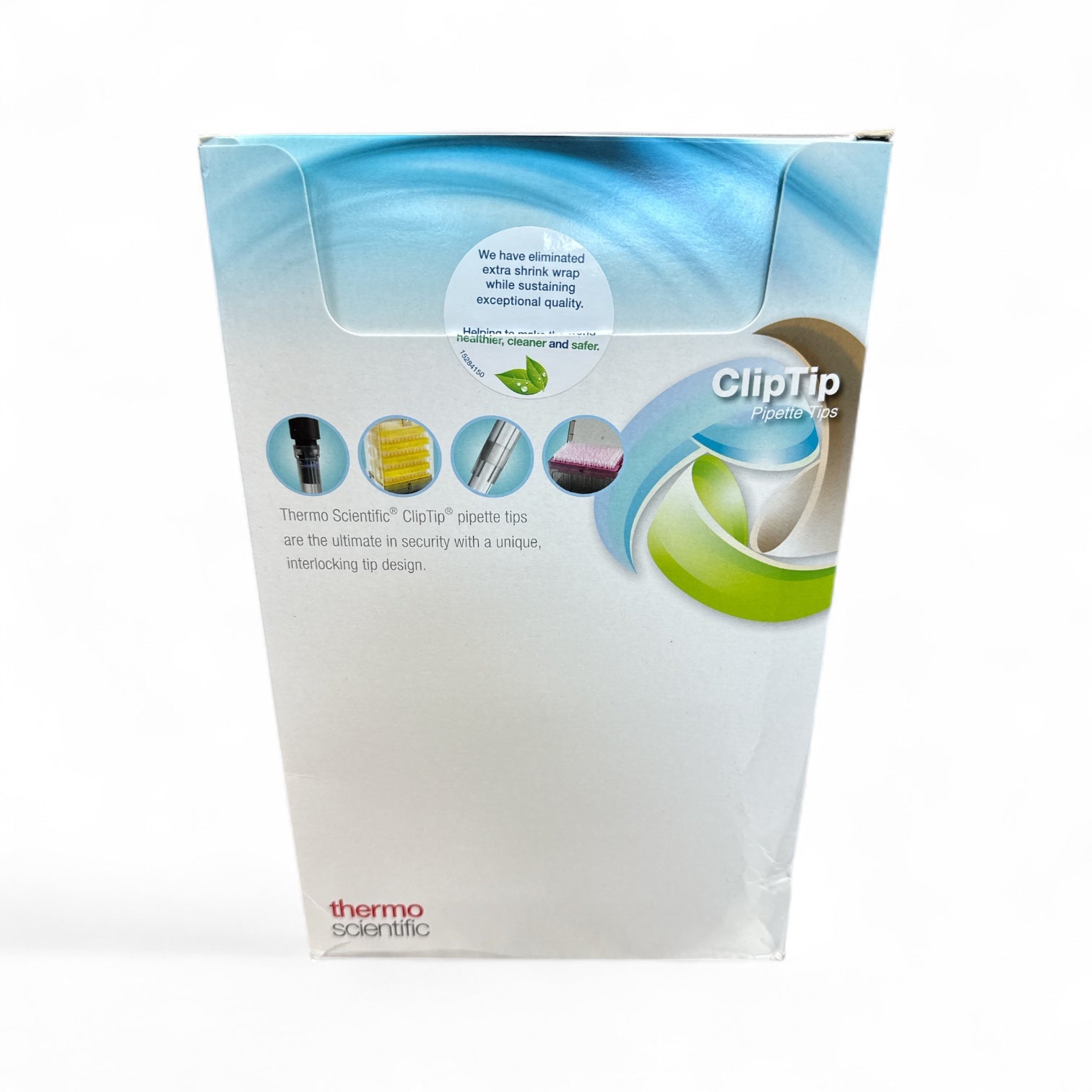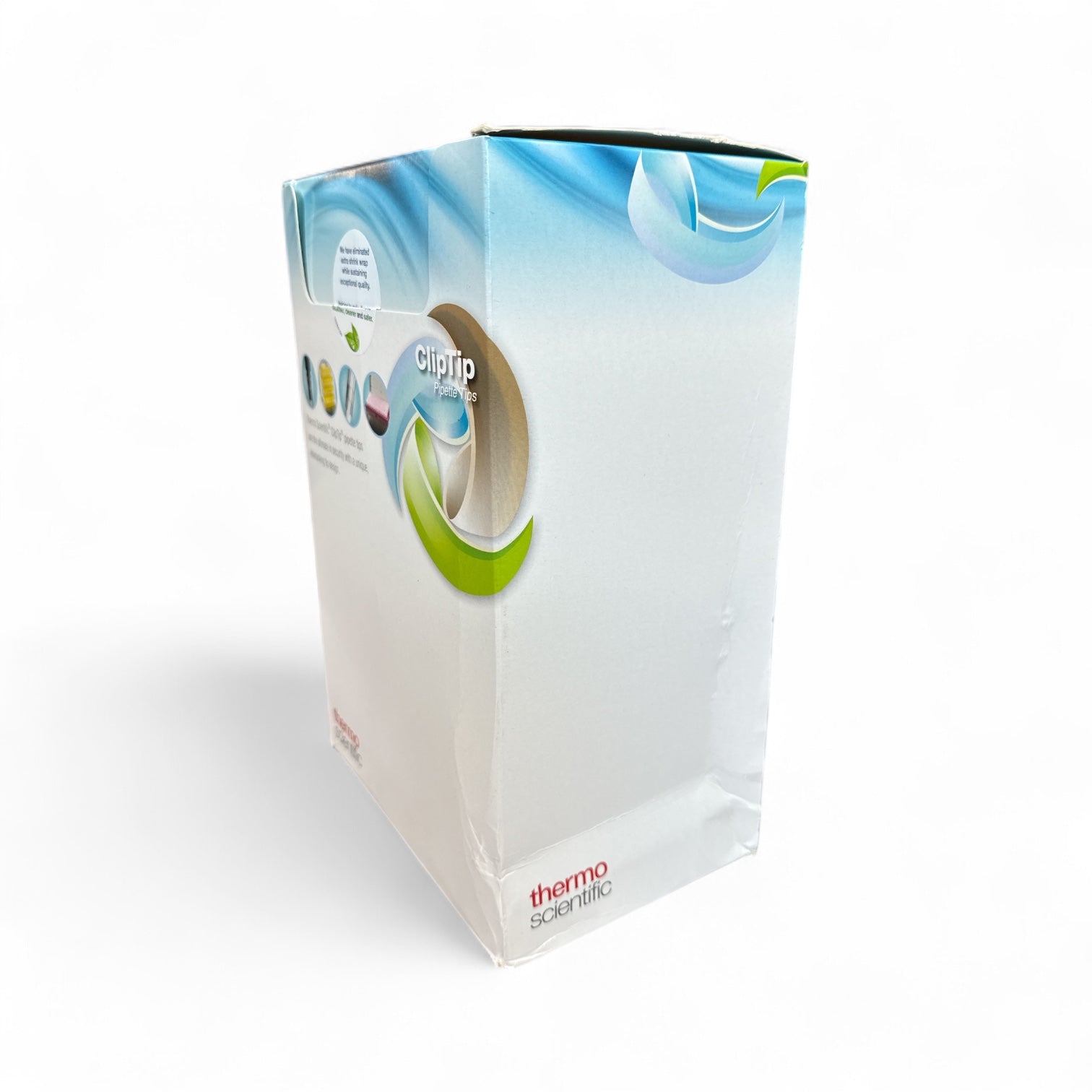 The Thermo Scientific ClipTip 300 Ext pipette tips feature low retention properties and a secure interlocking design, enhancing precision and reliability during liquid handling tasks. This factory-sealed box contains 10 racks of 96 tips each, ideal for high-throughput laboratories requiring consistent, high-quality pipetting performance. The packaging highlights environmental responsibility with reduced shrink wrap, ensuring sustainability without compromising on quality.