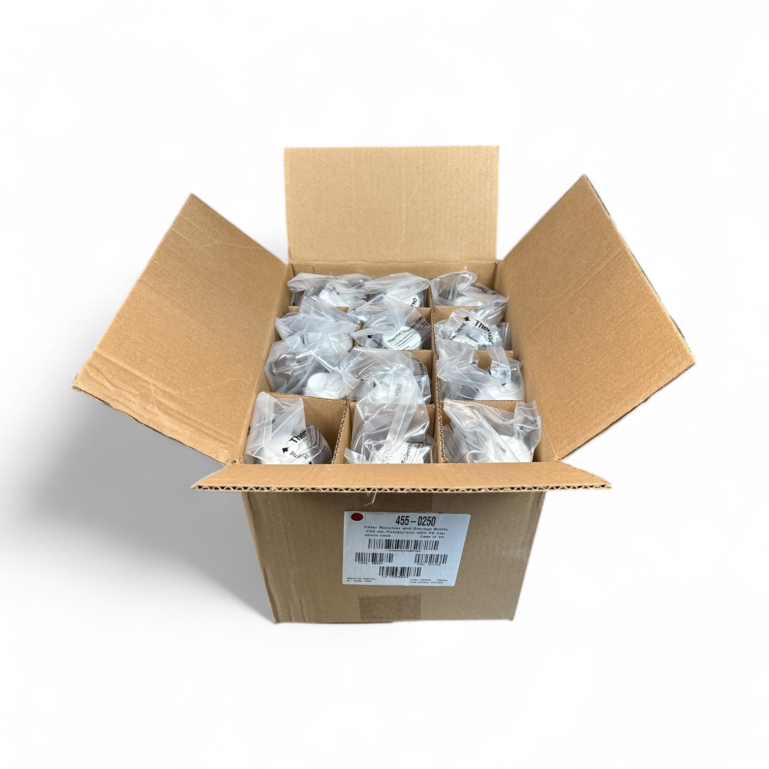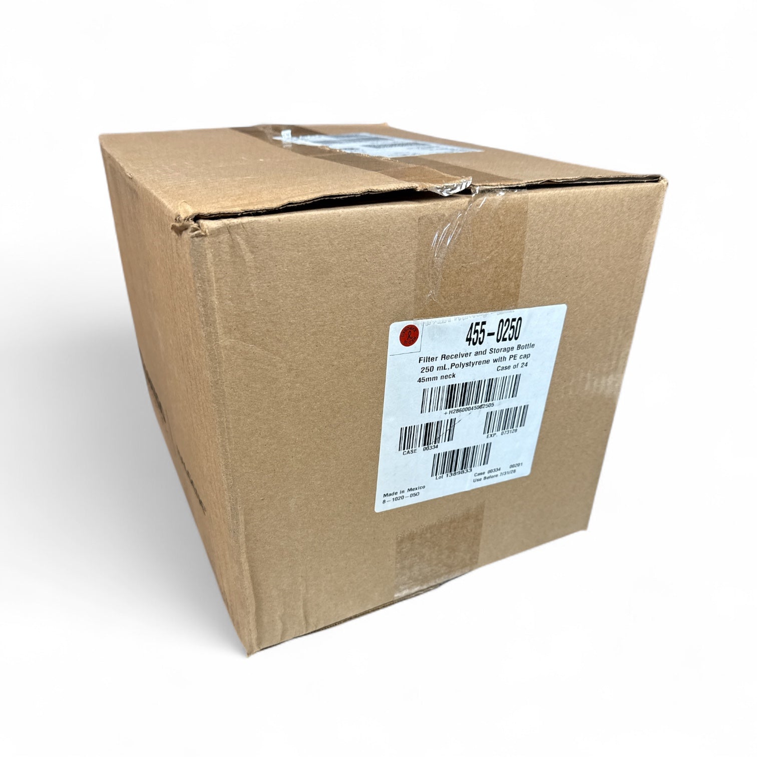 This is a factory-sealed case of Thermo Scientific Nalgene filter receiver and storage bottles, model 455-0250. Each unit features a 250 mL polystyrene body with a 45mm neck, designed for reliable sample collection and storage applications. Ideal for pairing with membrane filtration systems, these bottles are packaged individually for sterile transfer.