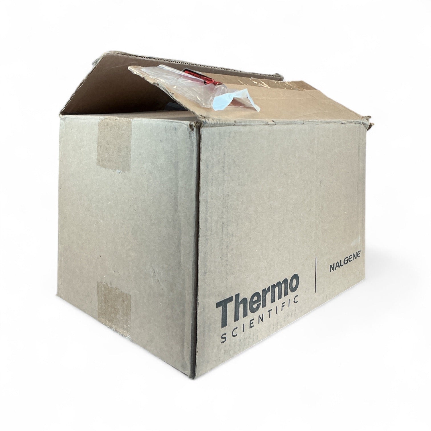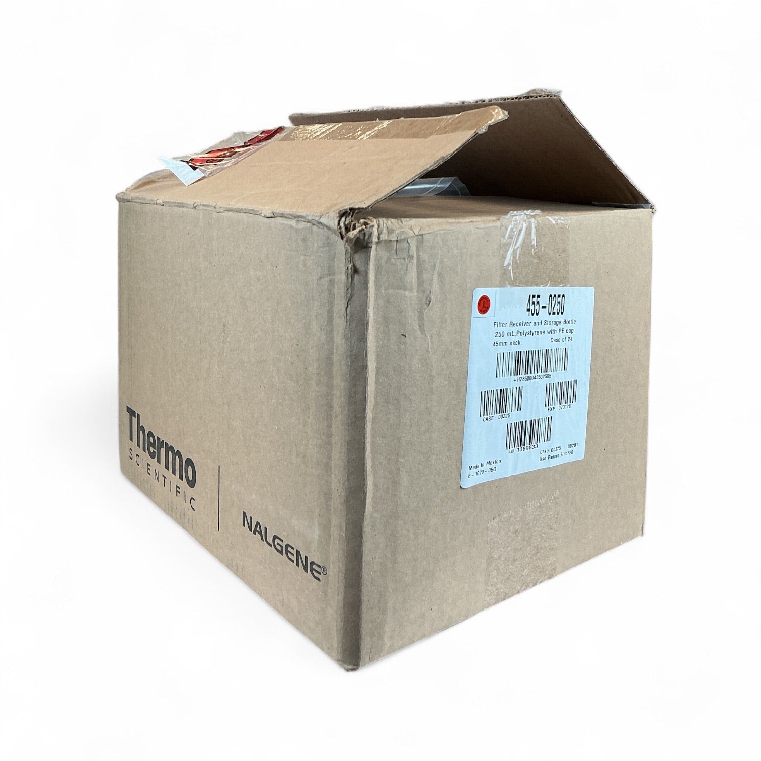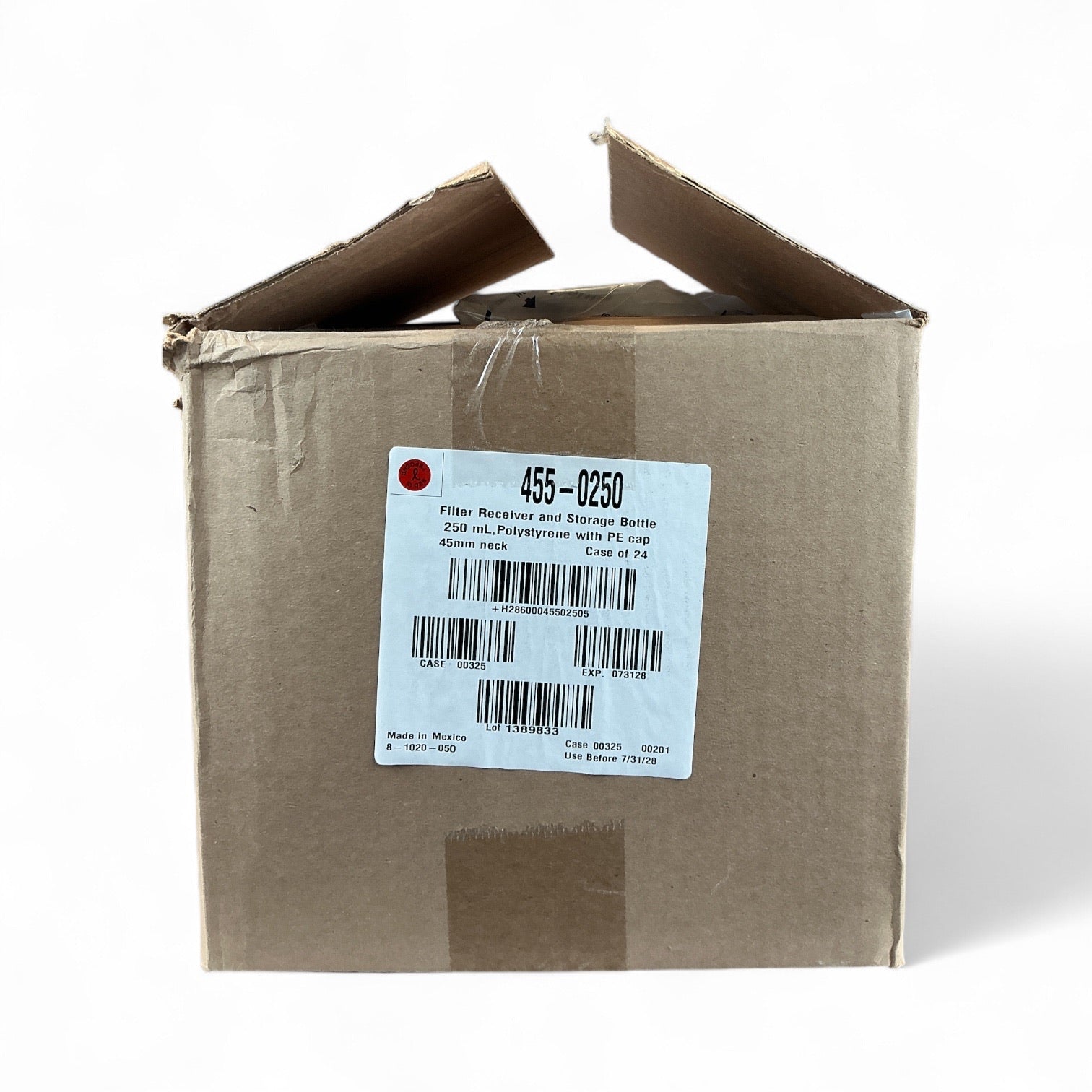 This listing is for a partial case of Thermo Scientific Nalgene 455-0250 filter receiver and storage bottles. Each bottle is 250 mL in volume and made of polystyrene, featuring a 45mm polyethylene (PE) cap. These bottles are ideal for filtration and storage applications in lab environments. Although originally packaged as a case of 24, this box contains only 20 bottles total. All bottles are unused and sealed in their original sterile packaging.