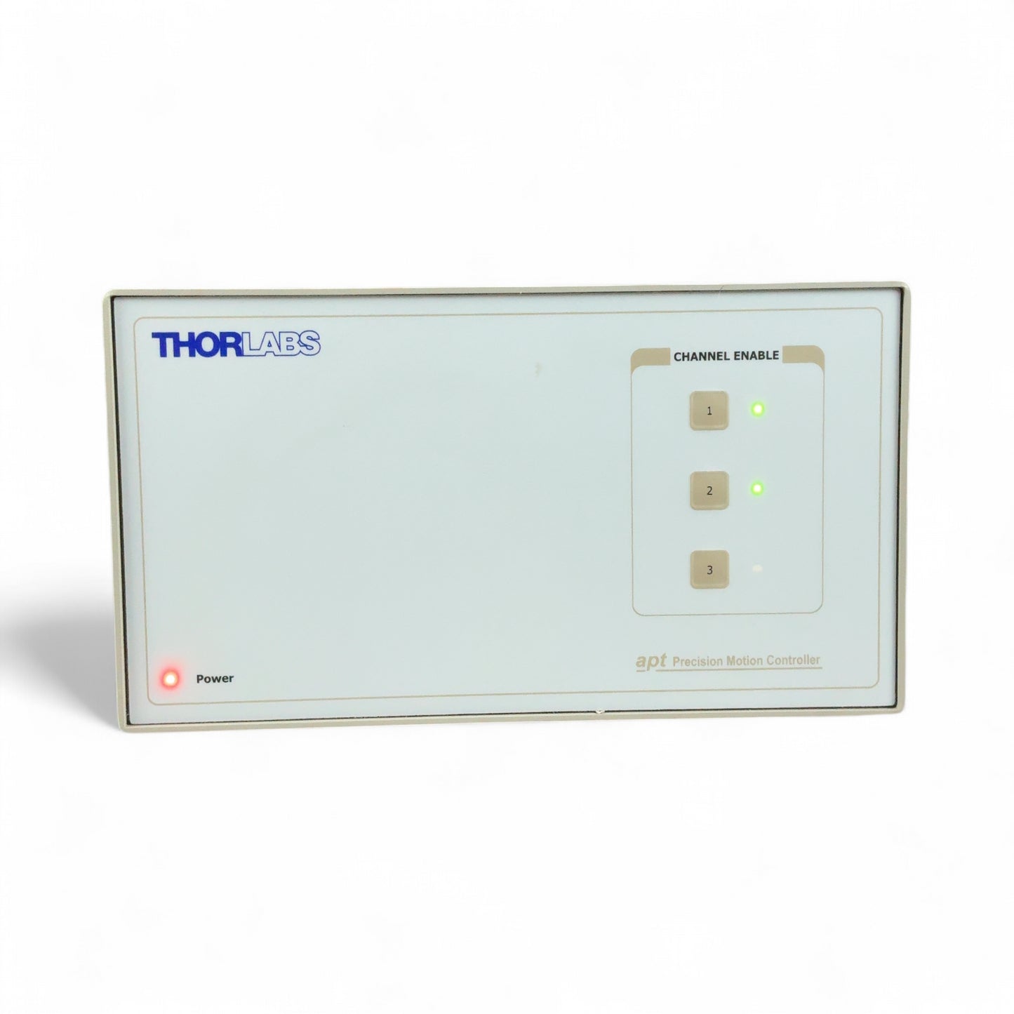 The stepper motor controller is in good cosmetic condition, exhibiting typical signs of use. The front panel is clean with clear labeling for Thorlabs, Power, Channel Enable, and apt Precision Motion Controller. The housing displays minor scuffs consistent with laboratory use. All ports and connectors on the rear panel are intact. Please review all photos for more details!