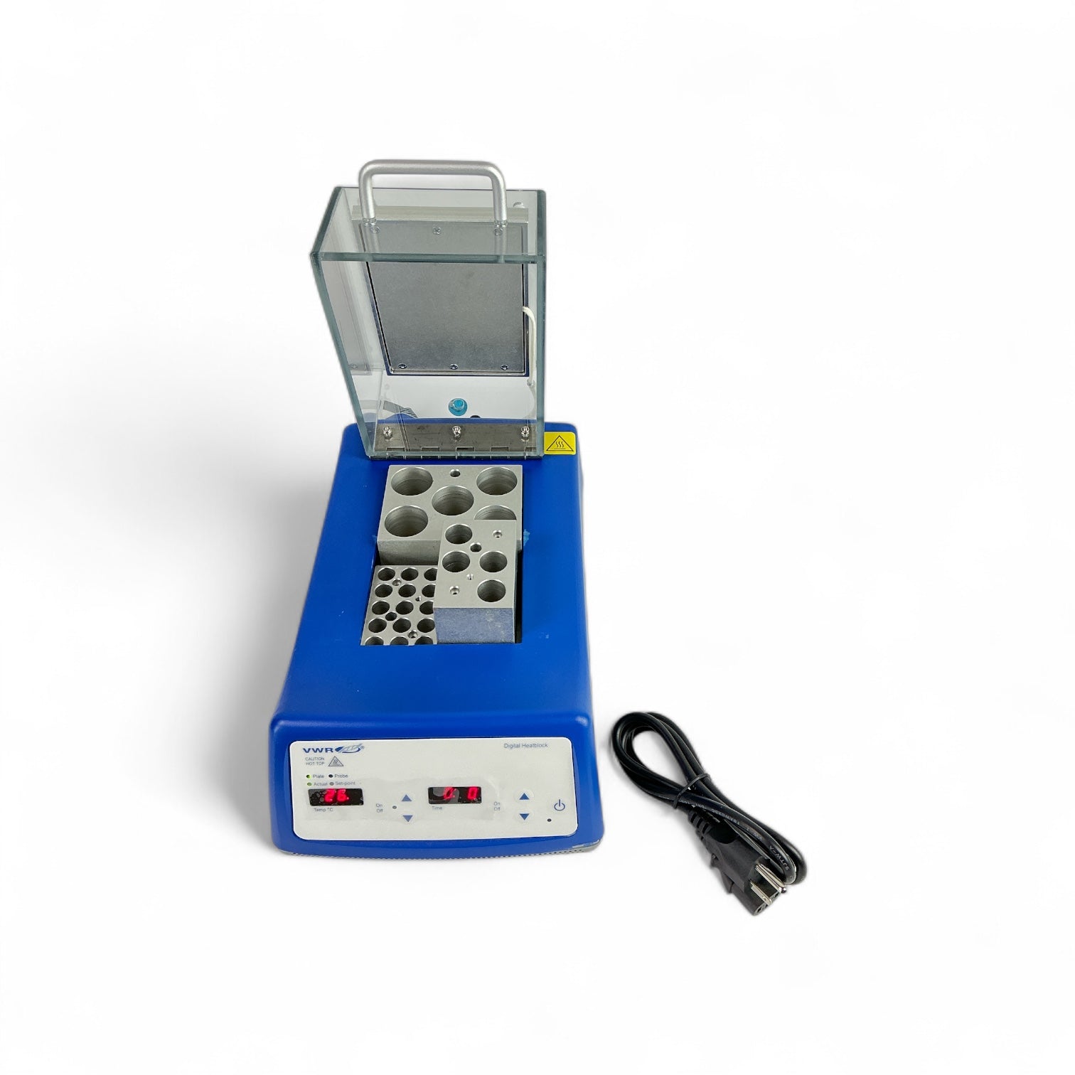 The VWR Advanced Digital Heatblock (Cat No. 75838-278) is a precision-controlled dry block heater with capacity for two interchangeable blocks and an integrated heated lid to prevent condensation. This unit provides uniform heating and is ideal for incubation, enzyme reactions, and sample prep. Includes aluminum blocks as shown and powers on with digital display active.